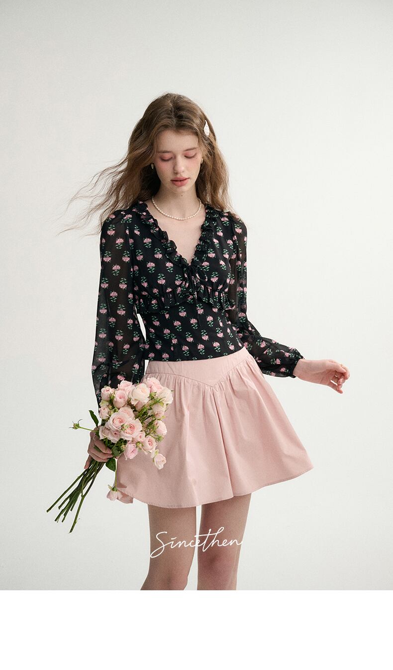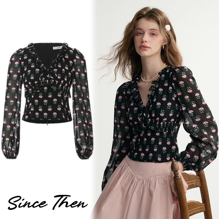 Since Then フレンチ 花柄 Vネック トップス ブラック