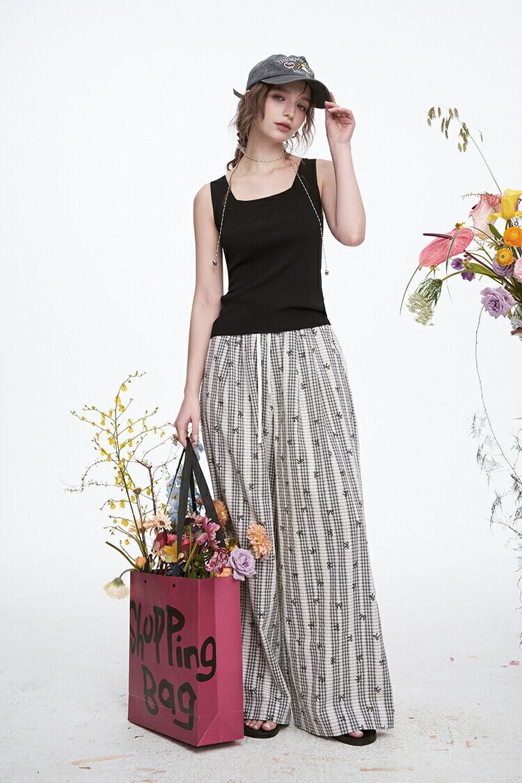 ELFSACK ワイド ボトムス チェック柄 レース ワイドパンツ