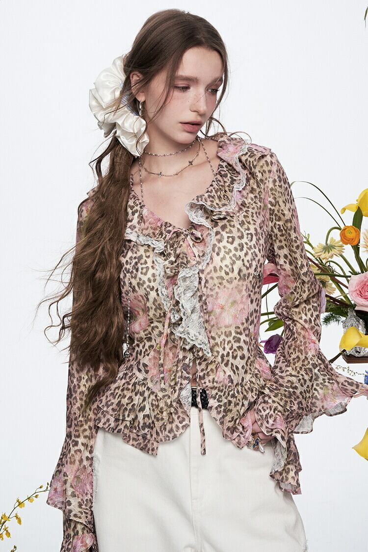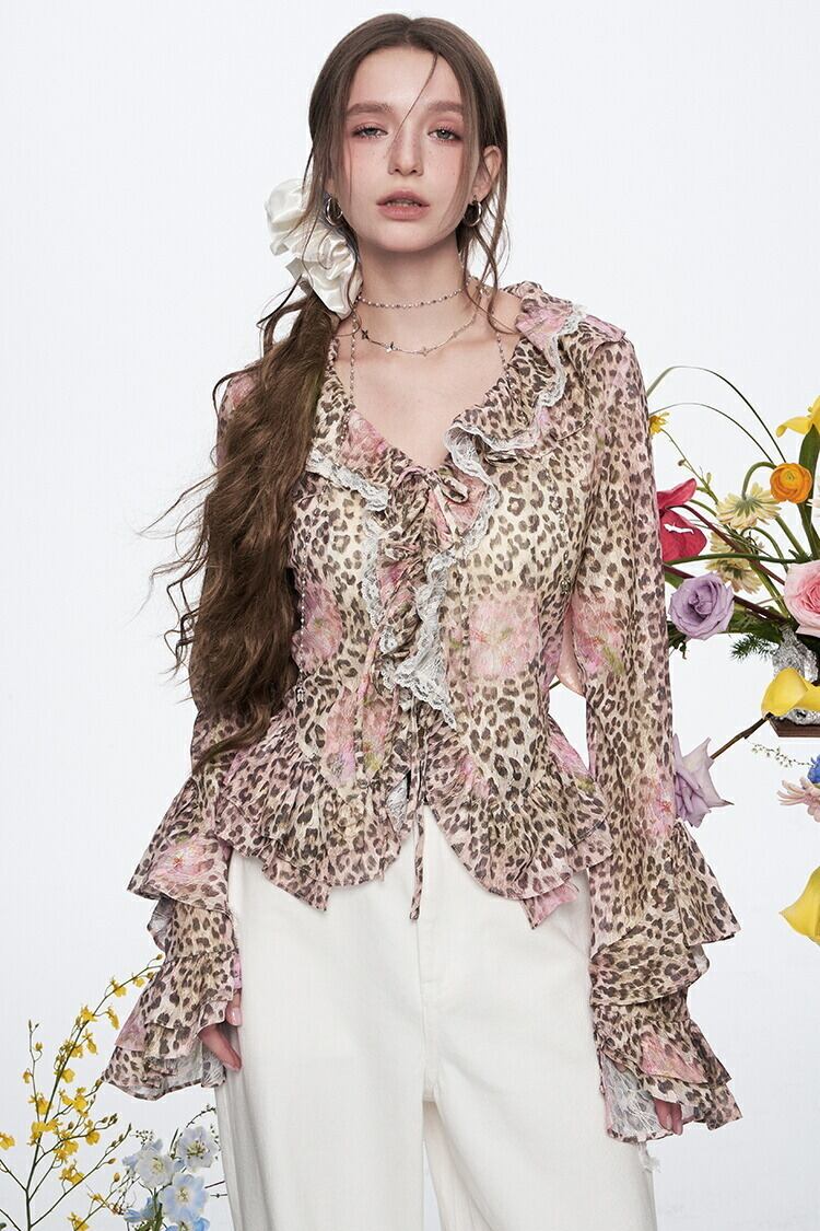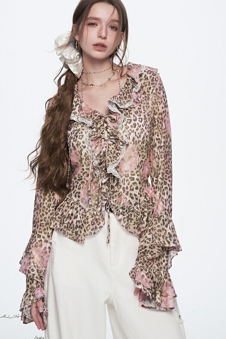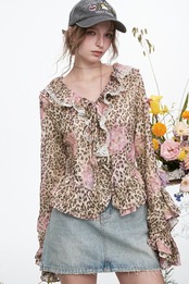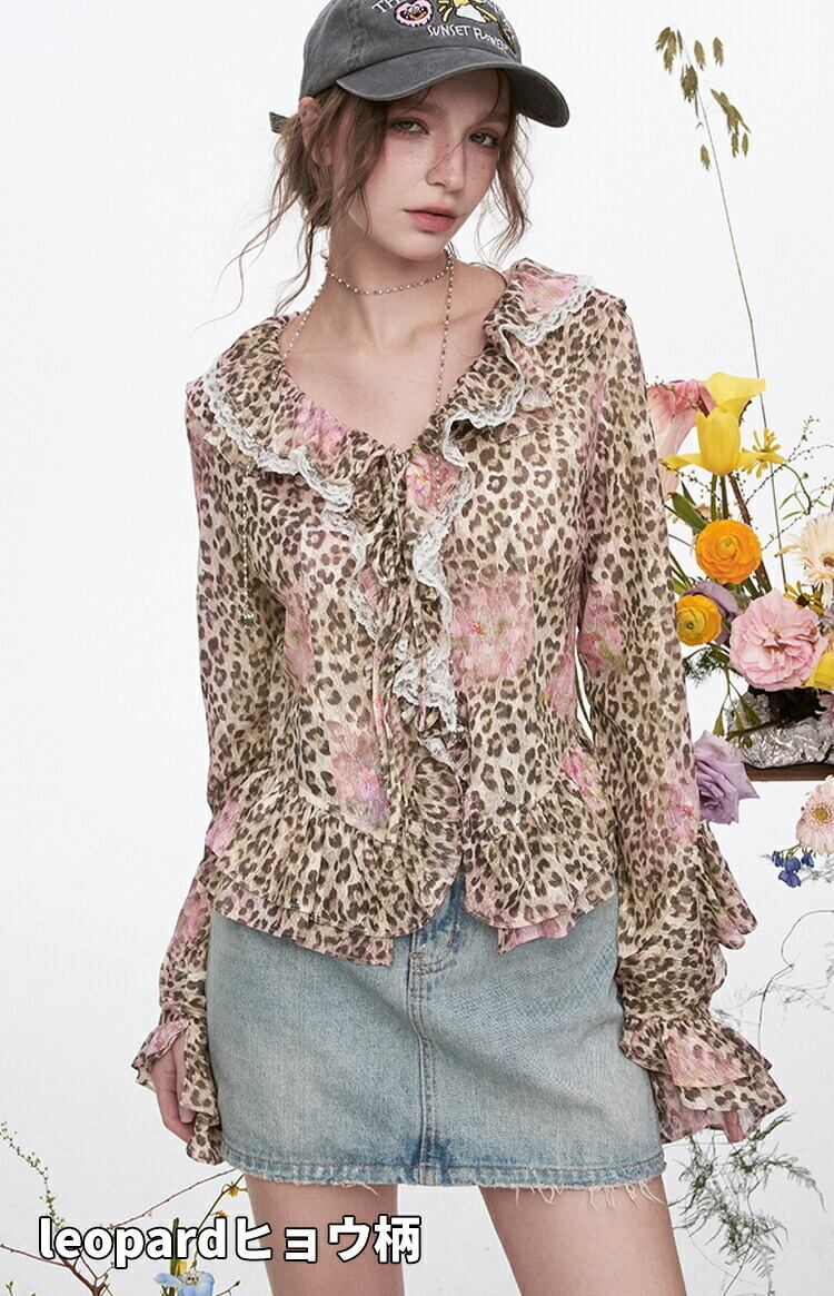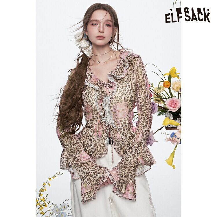 ELFSACK シフォン ブラウス フリル ヒョウ柄 長袖 シャツ