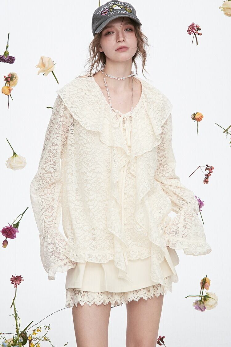 ELFSACK フレンチスタイル レース フリル シフォン シャツ