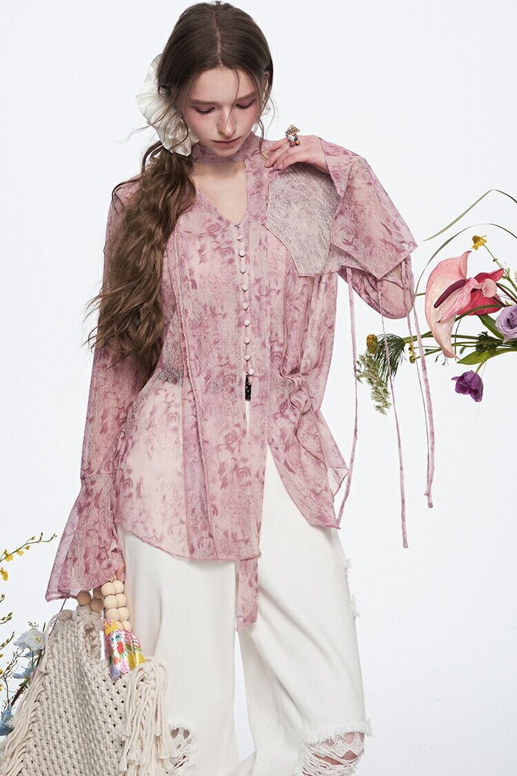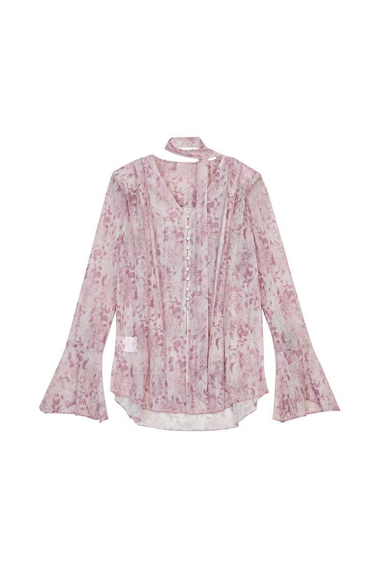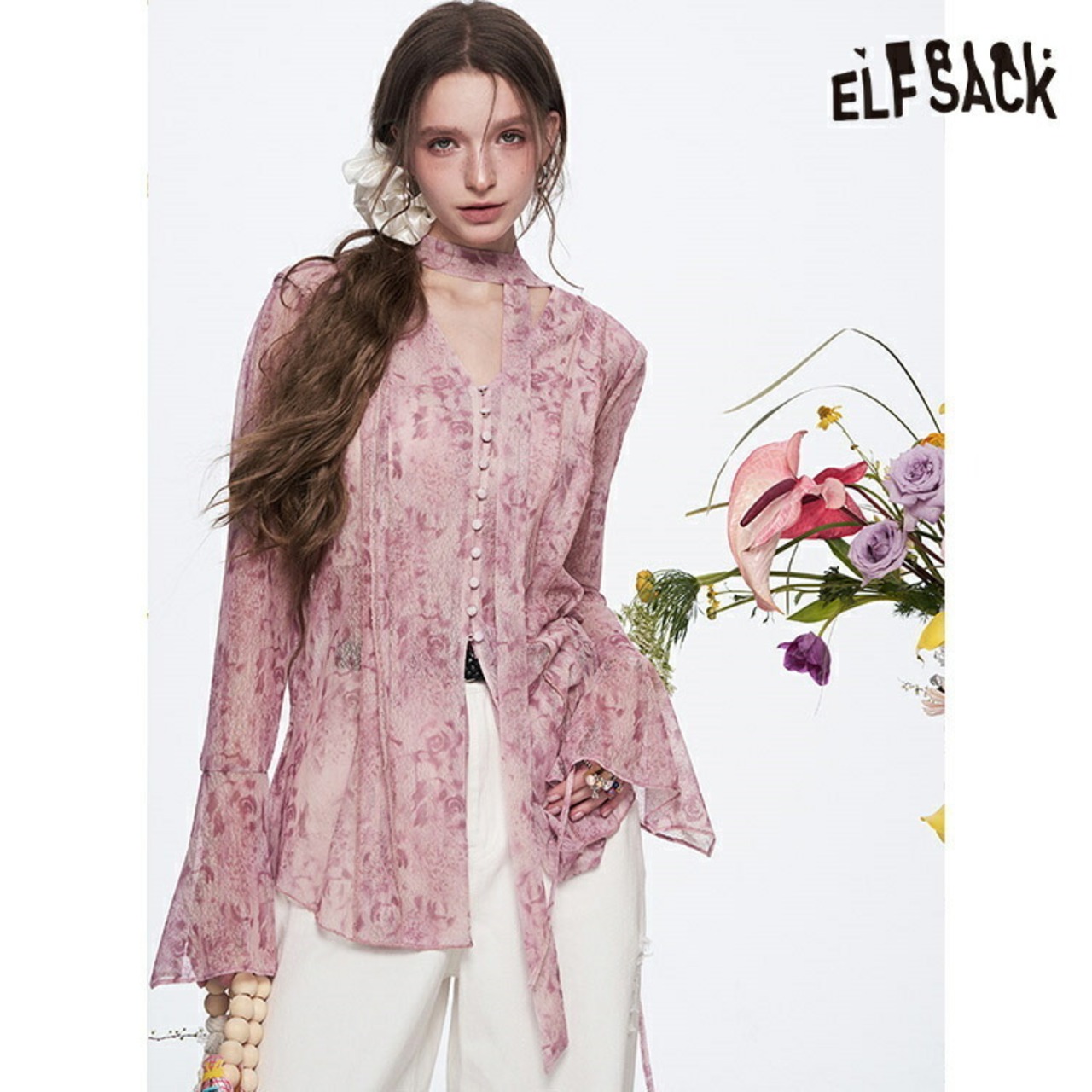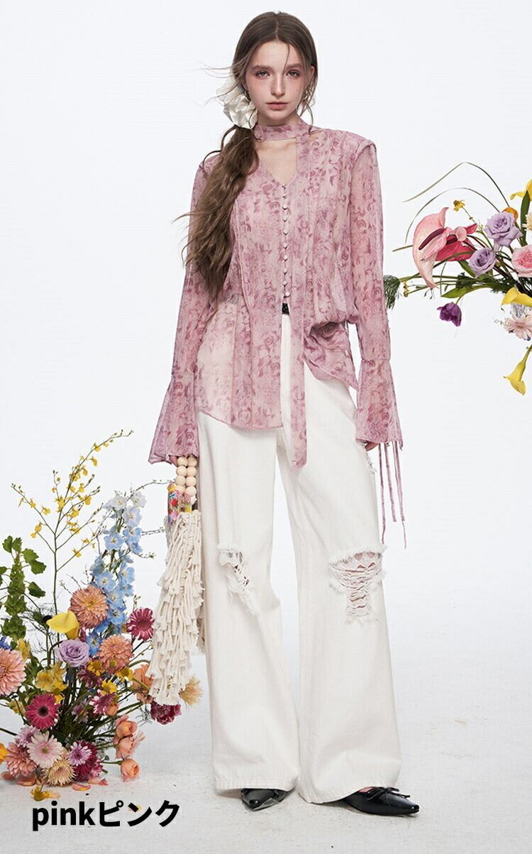ELFSACK Vネック フレンチスタイル 花柄 シフォン シャツ ピンク