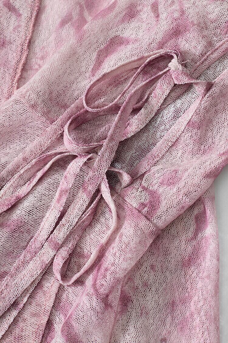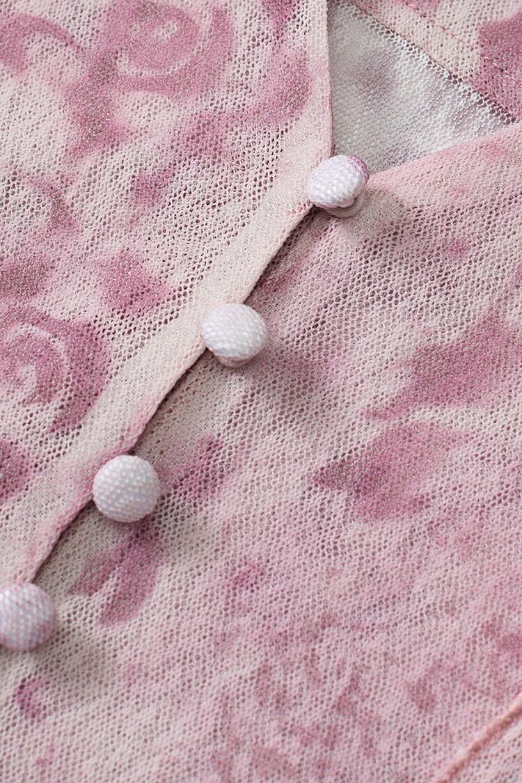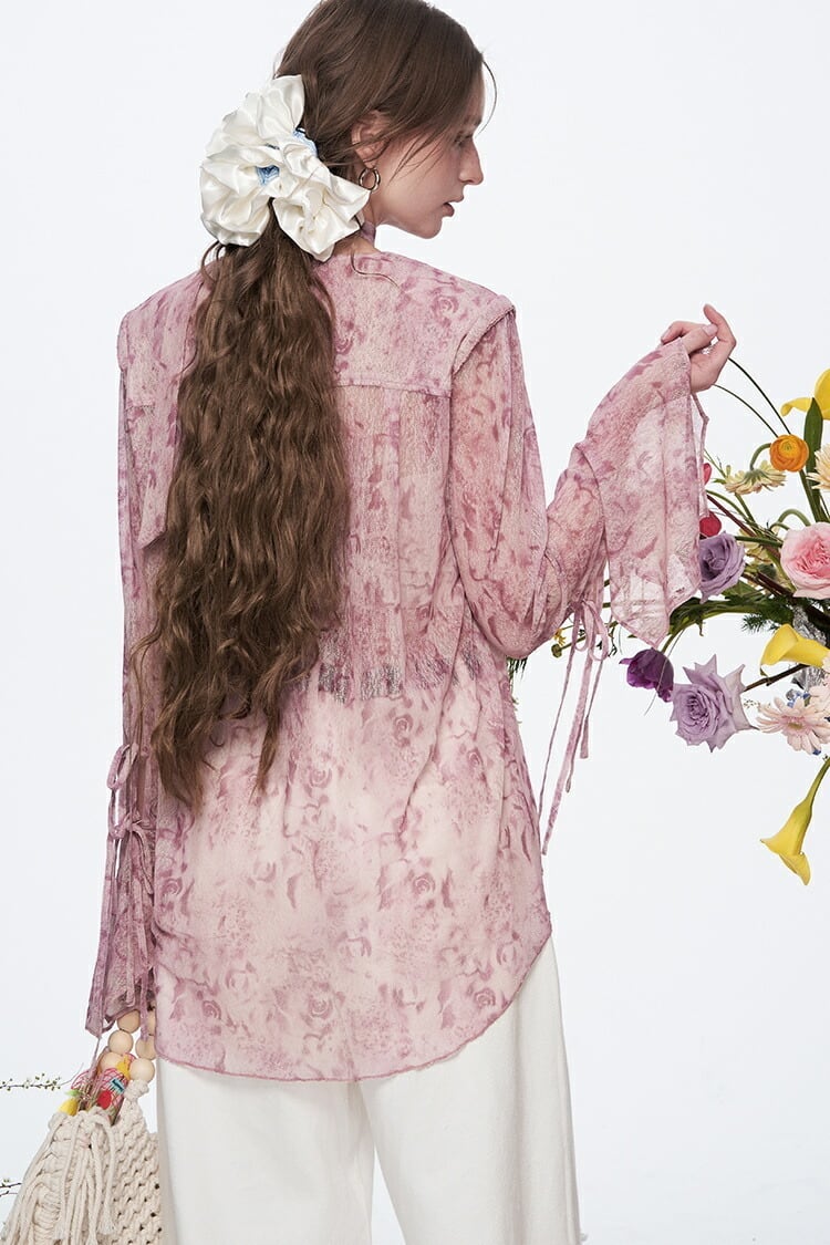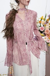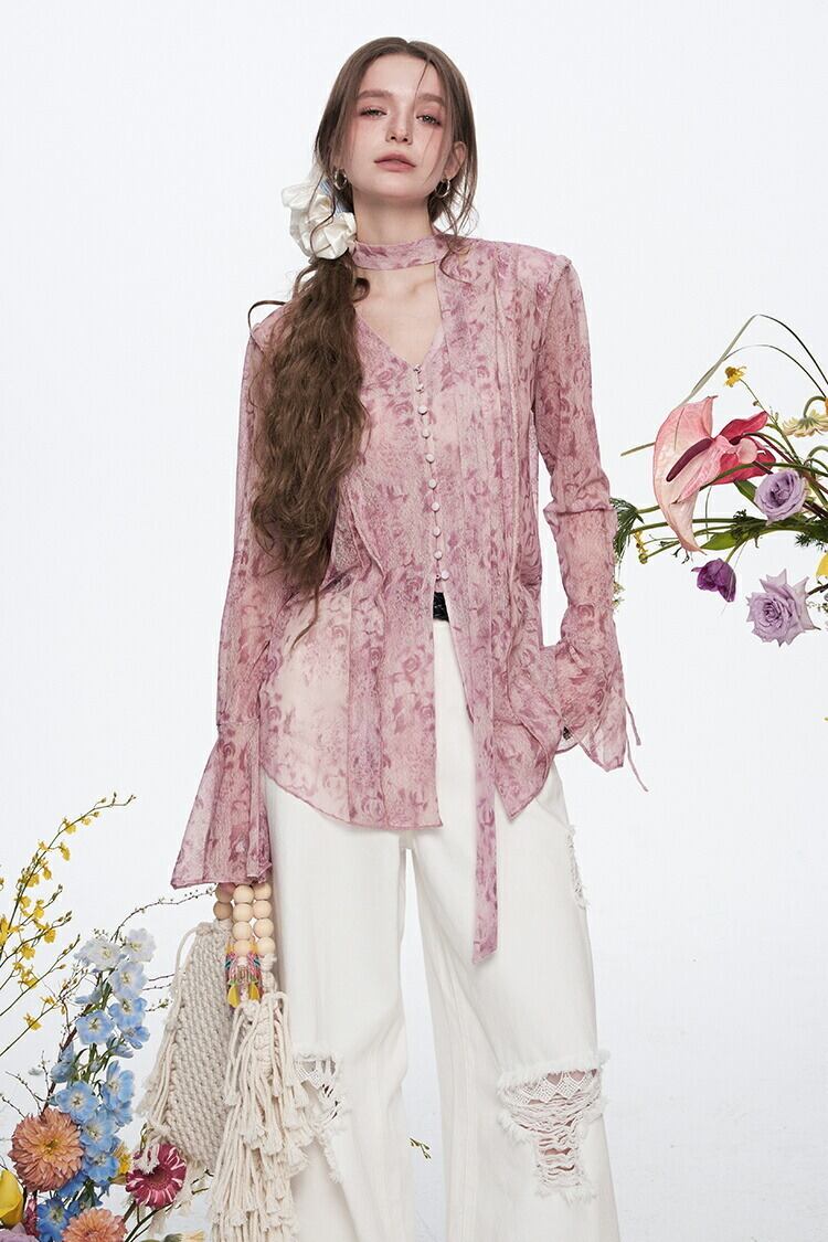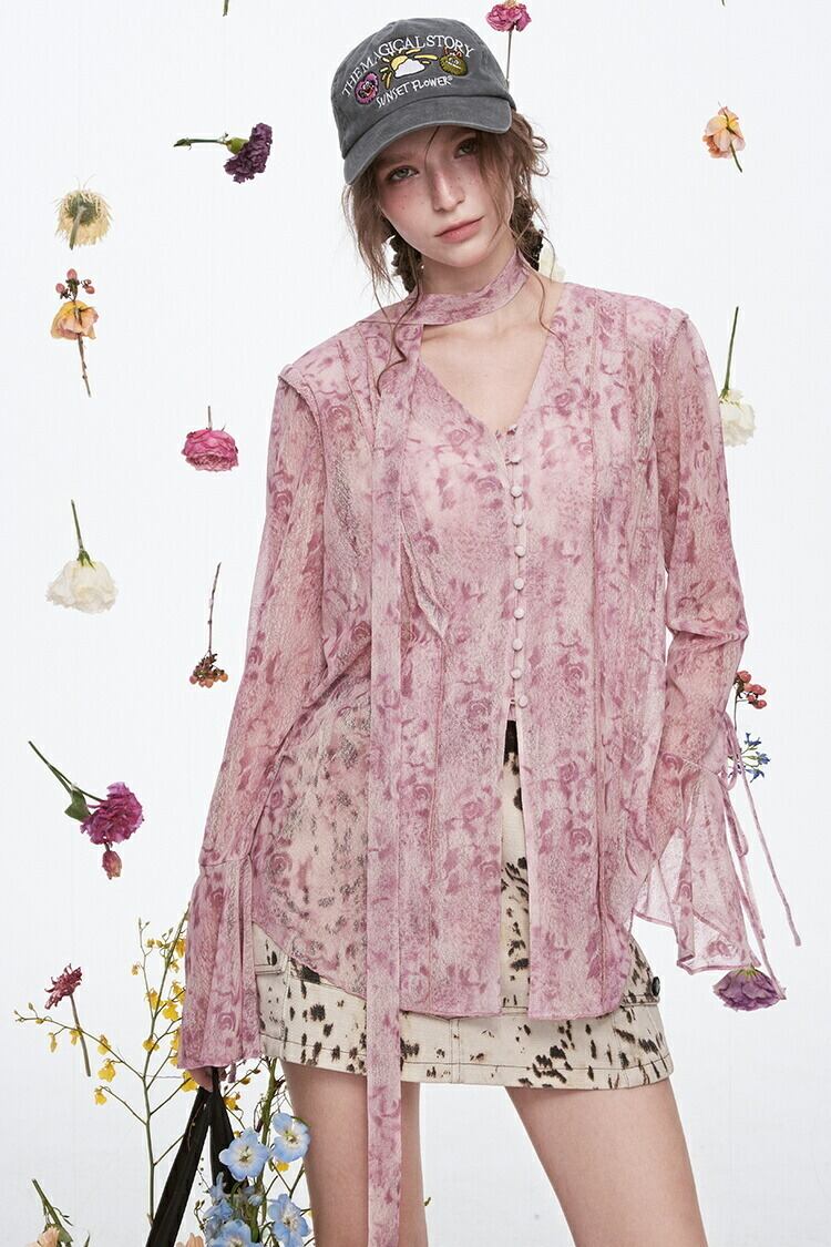 ELFSACK Vネック フレンチスタイル 花柄 シフォン シャツ ピンク