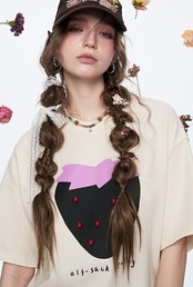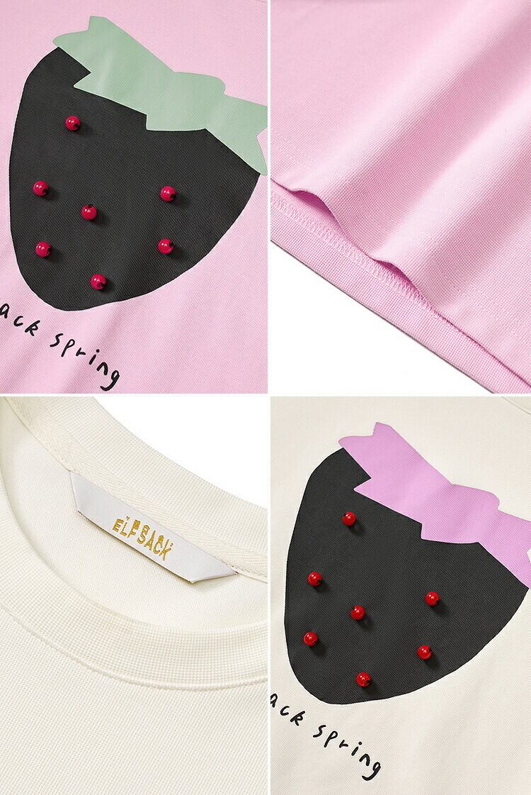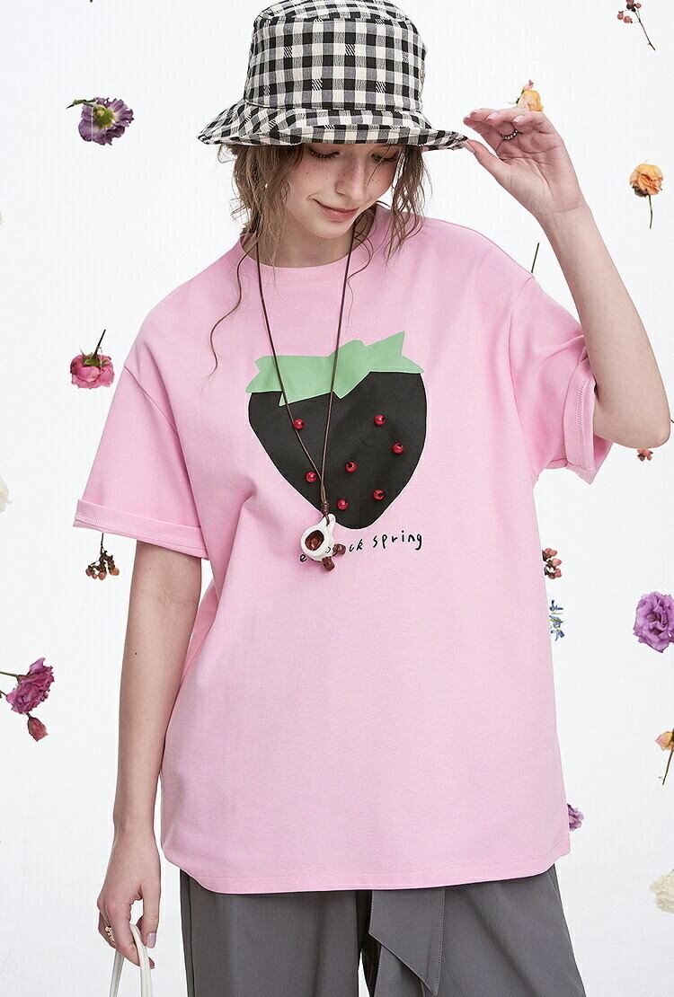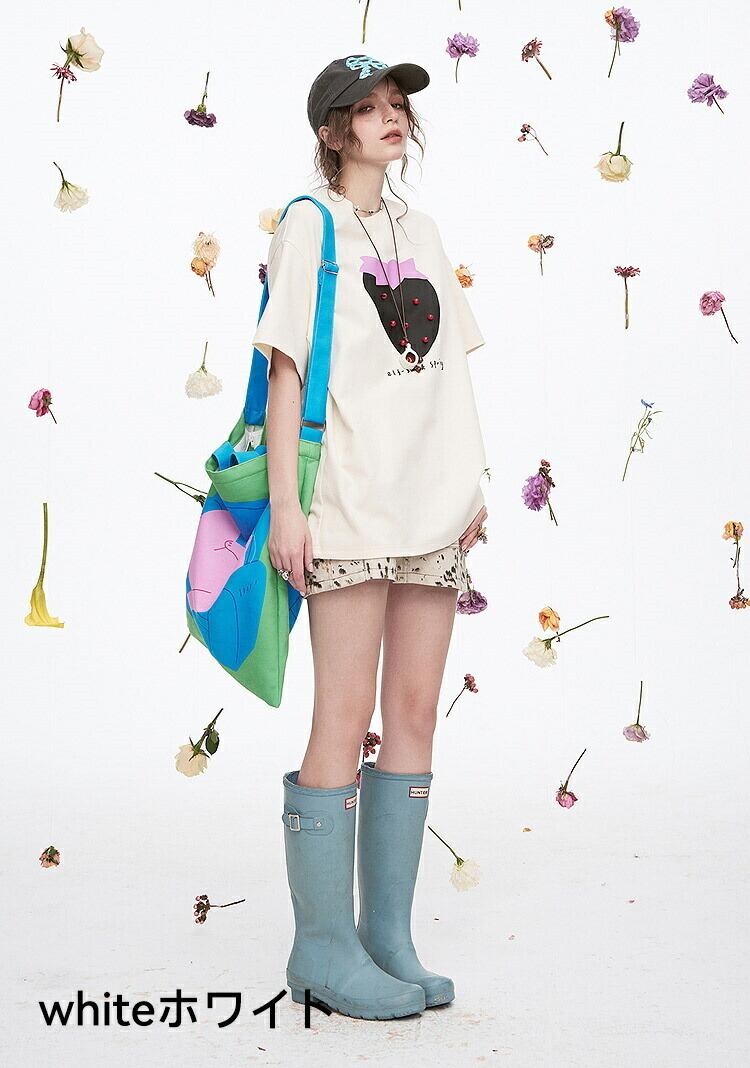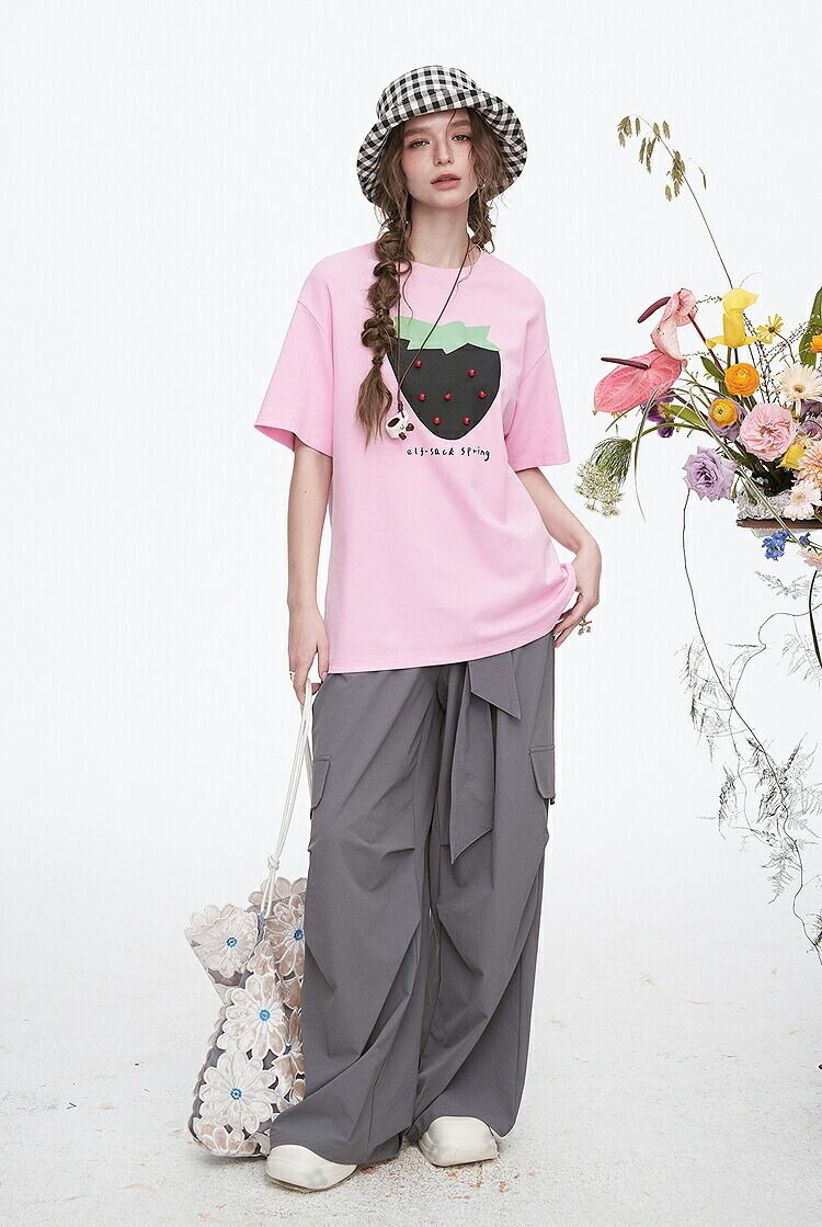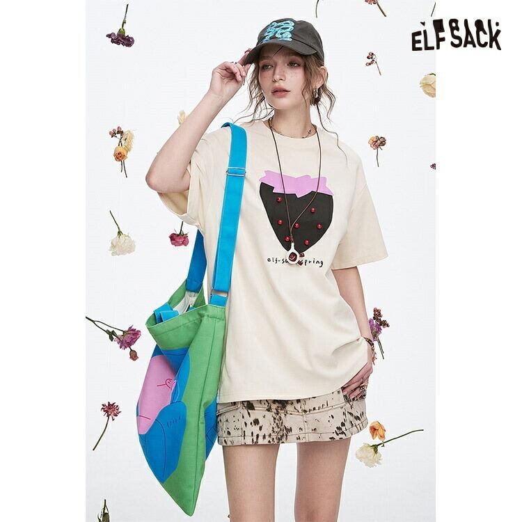 ELFSACK Tシャツ トップス 半袖 丸首 苺柄 ゆったり