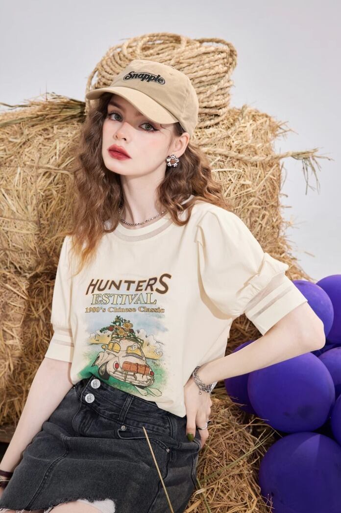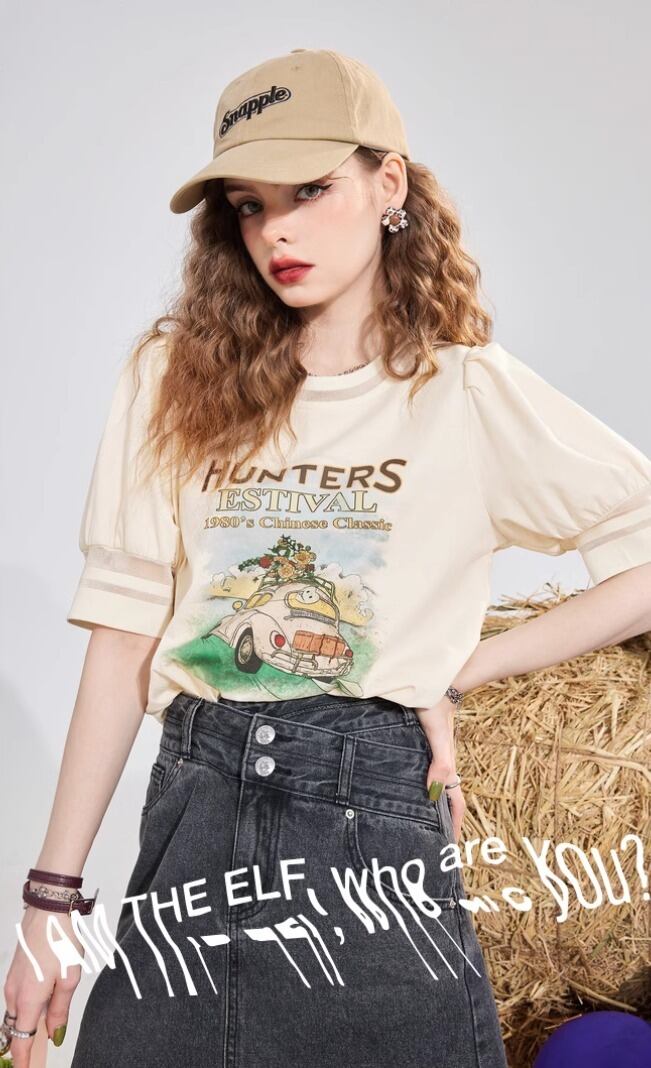 ELF SACK プリント クルーネック 半袖 Tシャツ ベージュ
