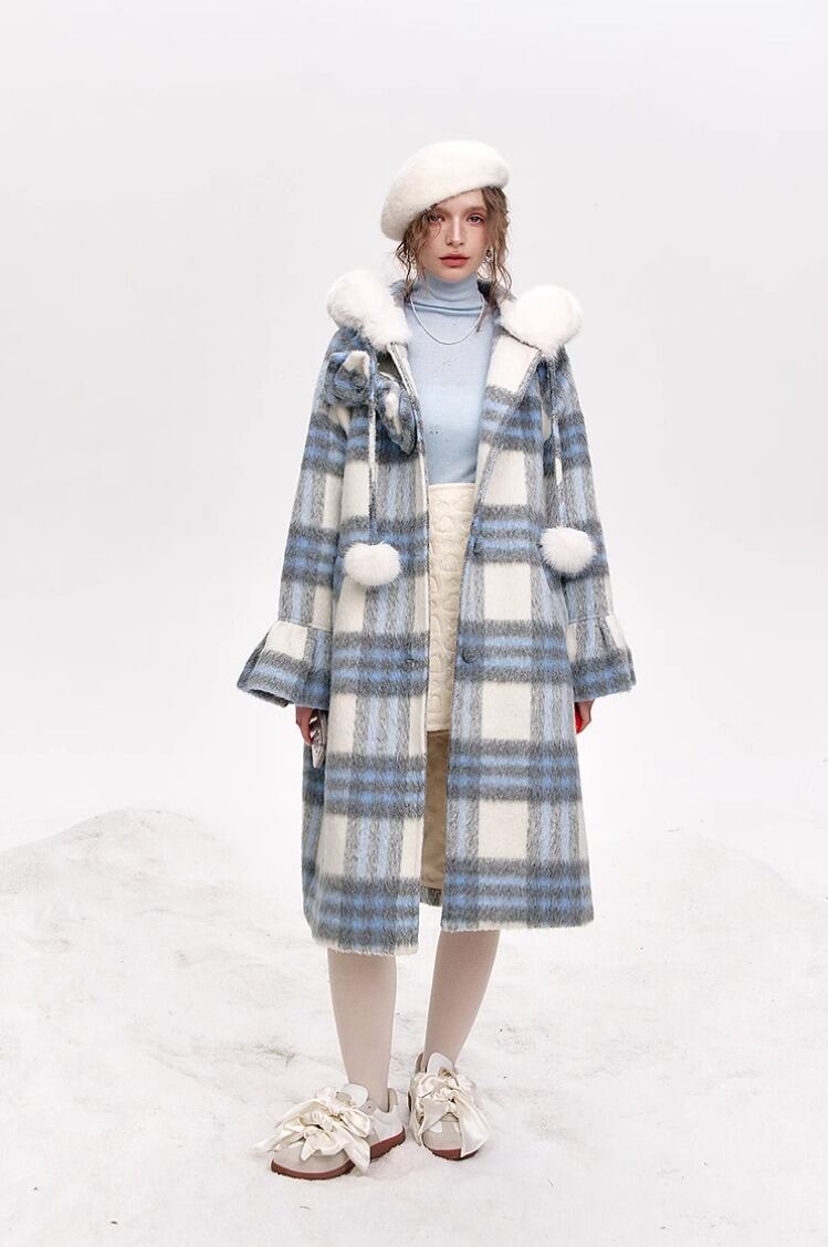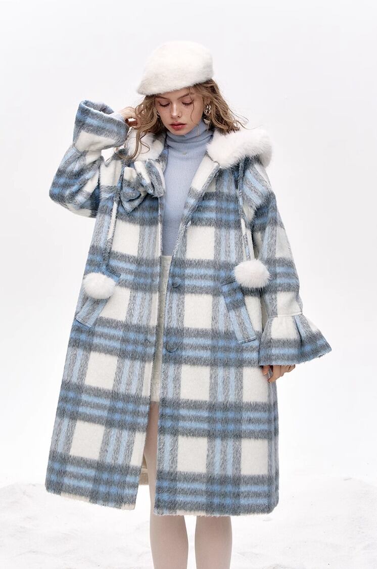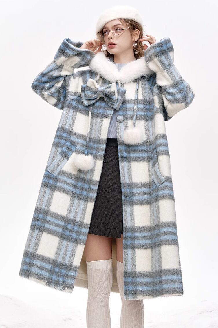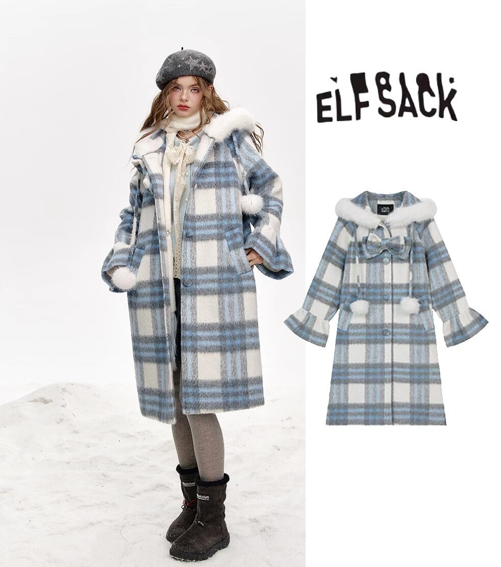 ELF SACK チェック柄 フード付 ロングコート ブルー