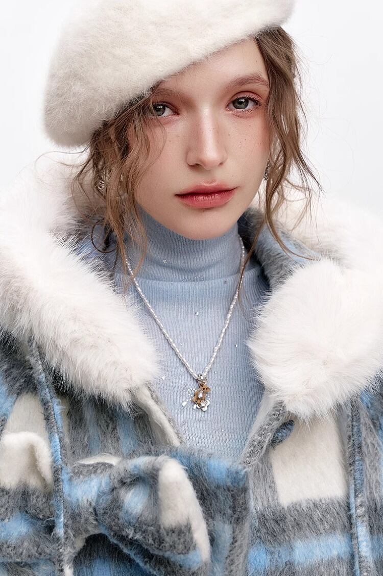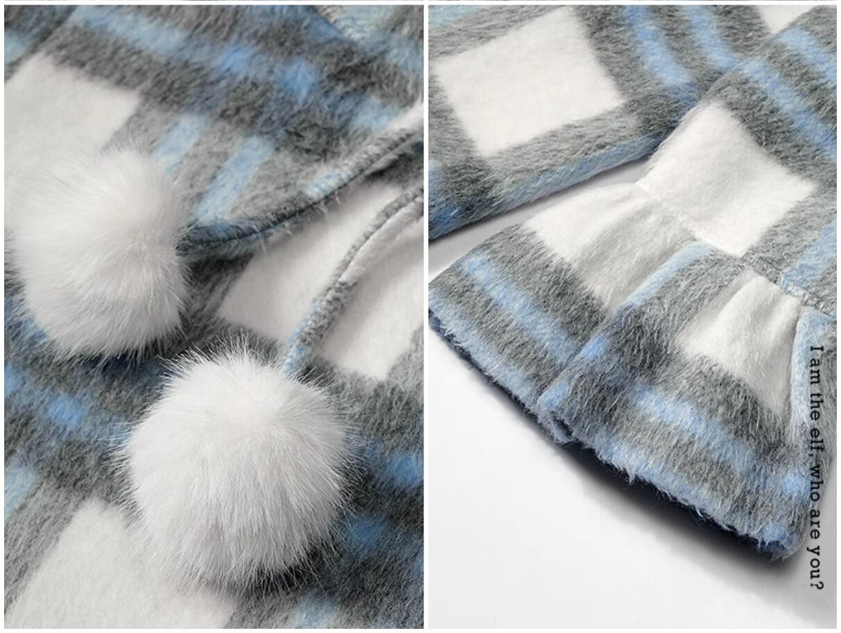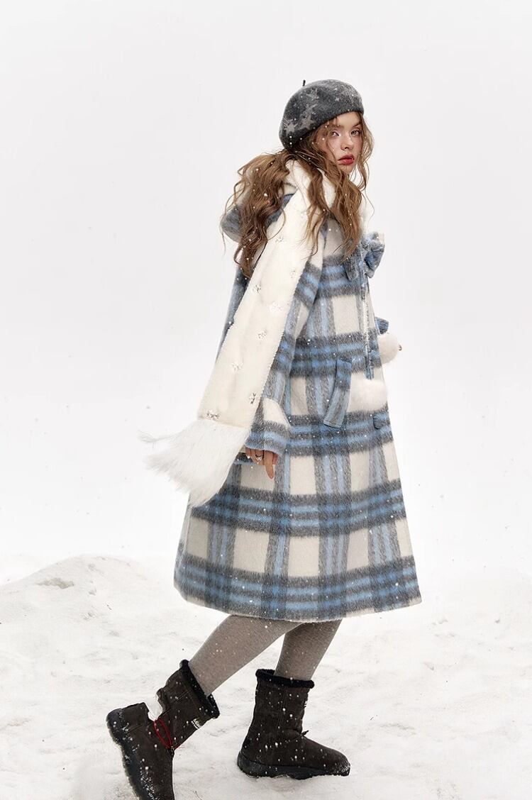ELF SACK チェック柄 フード付 ロングコート ブルー