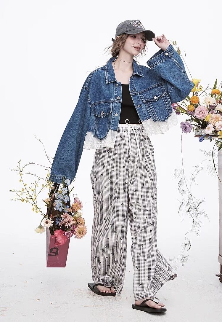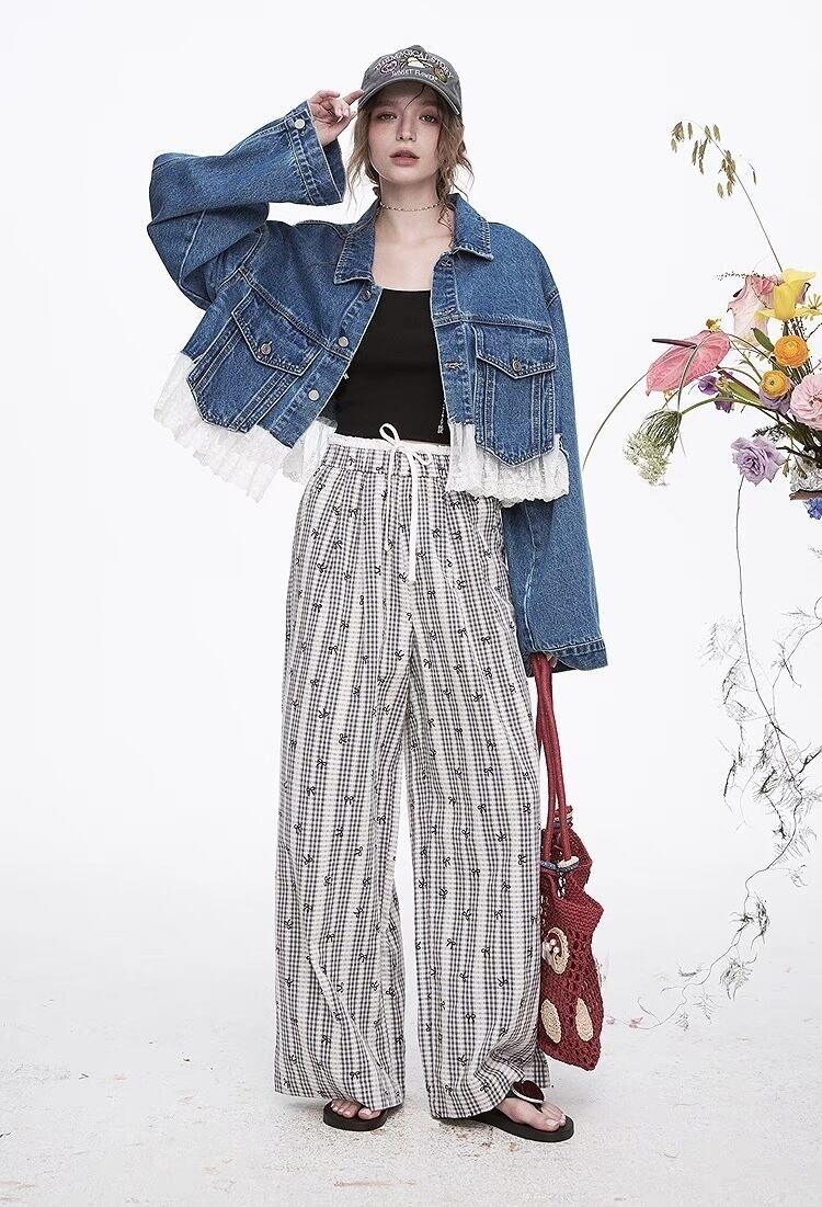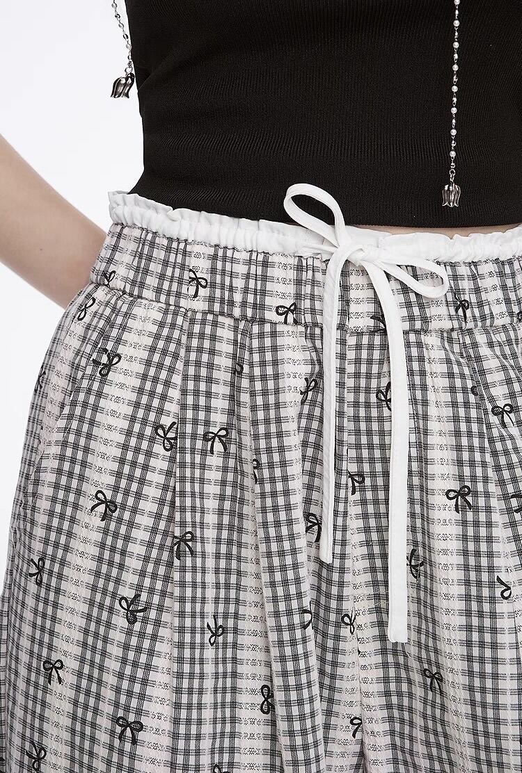 ELF SACK リボン チェック柄 レース ロングパンツ