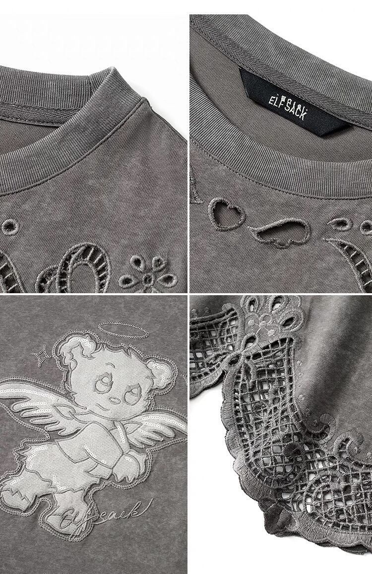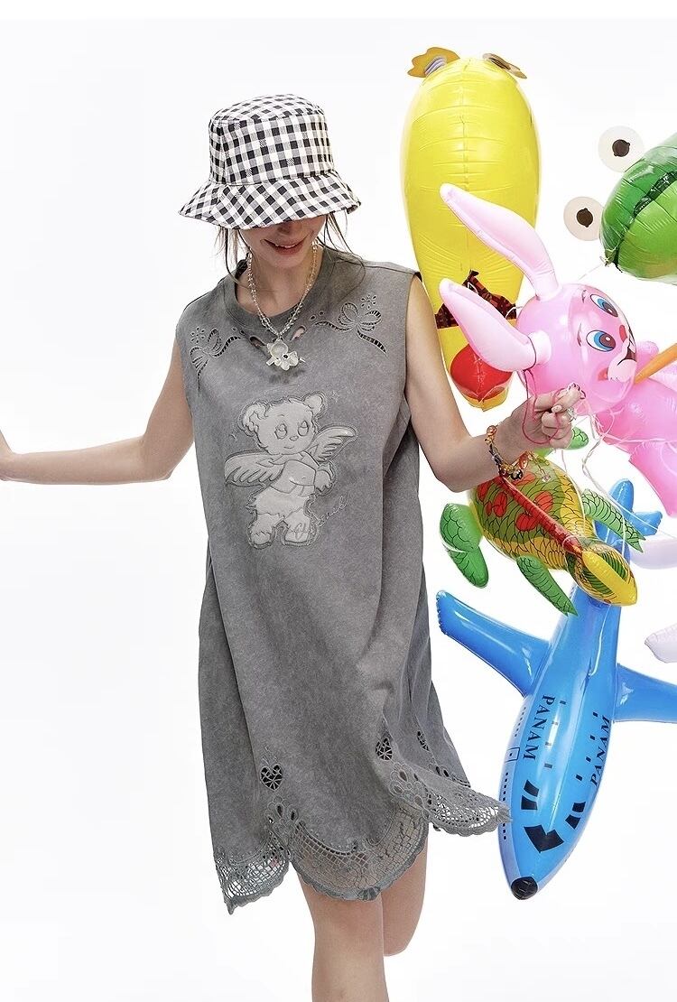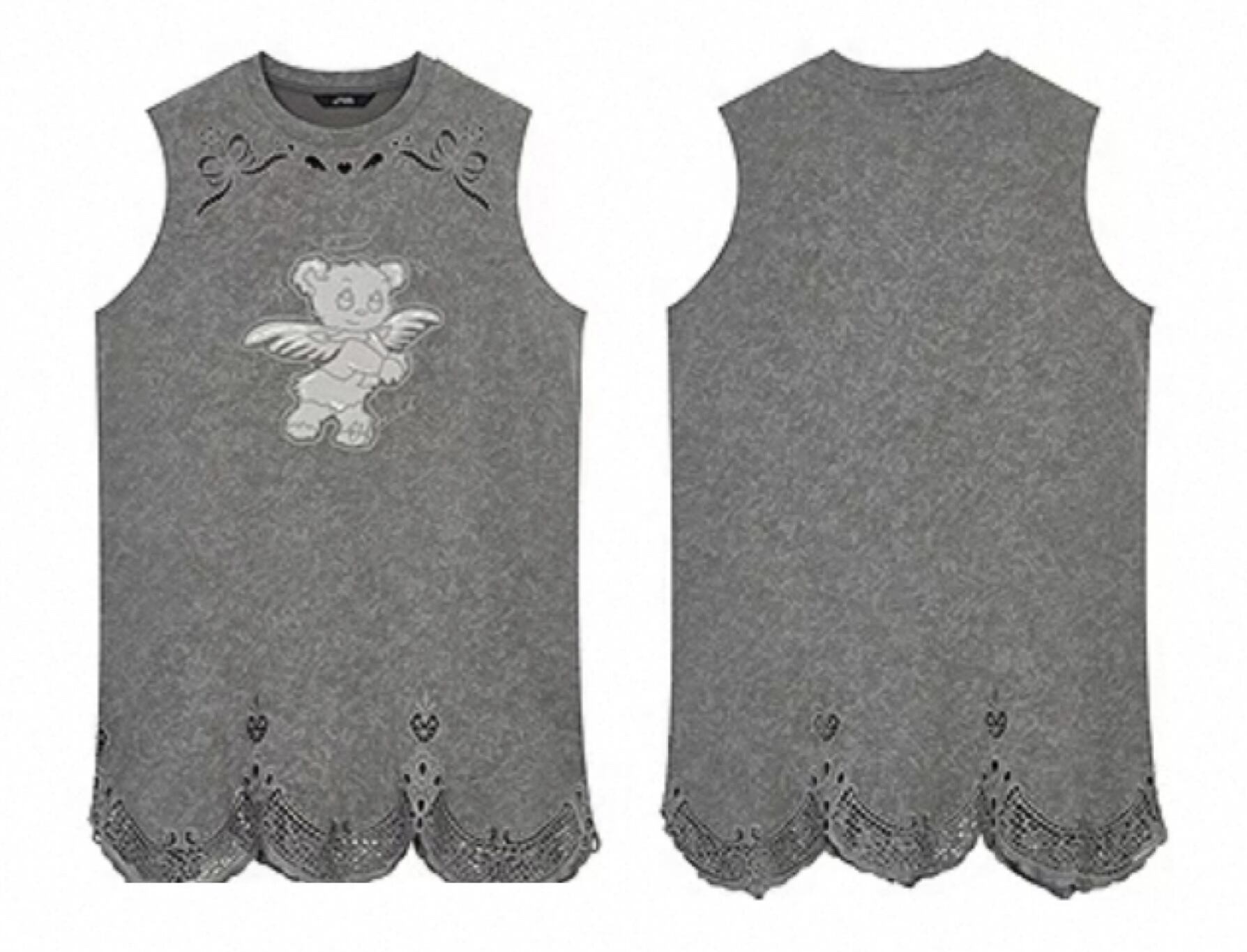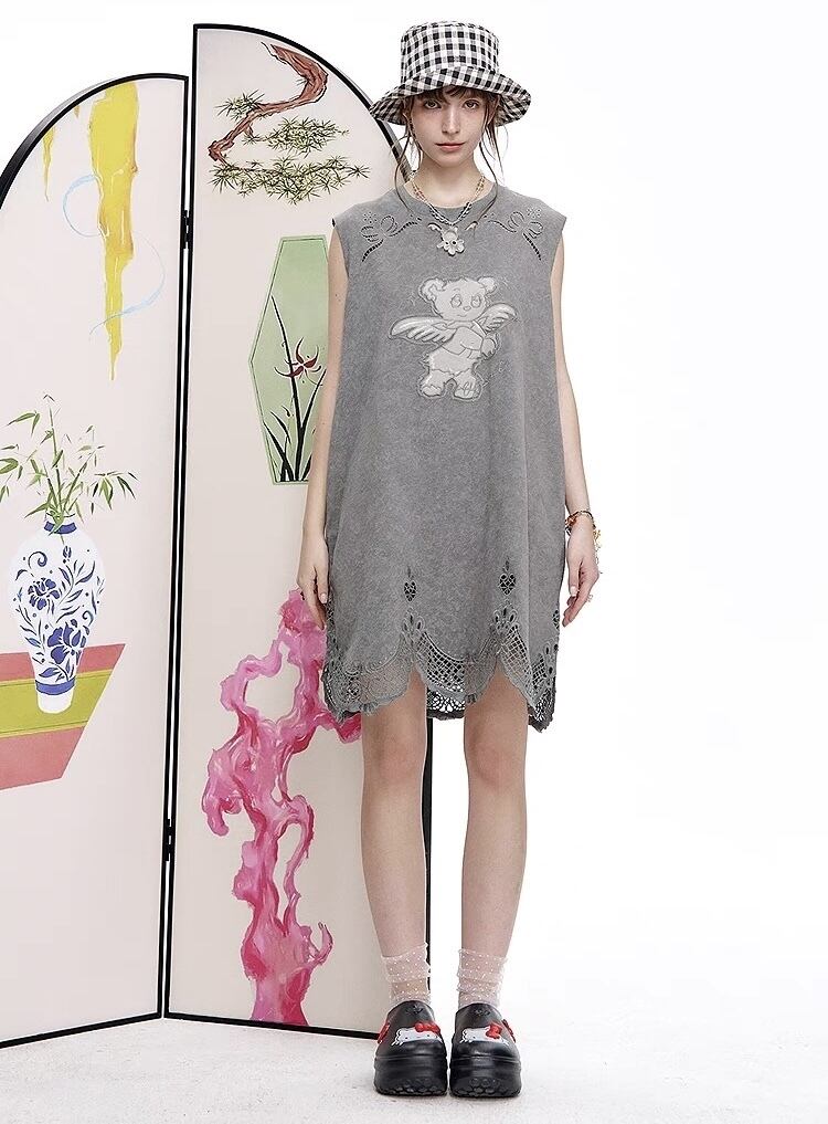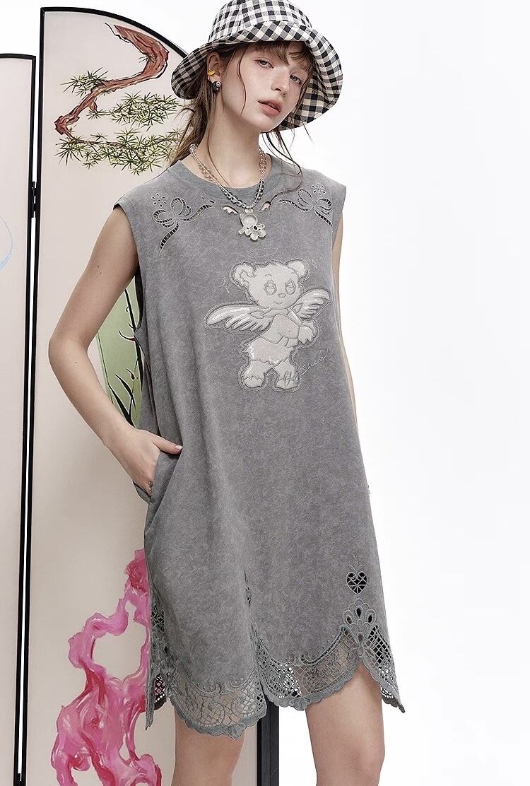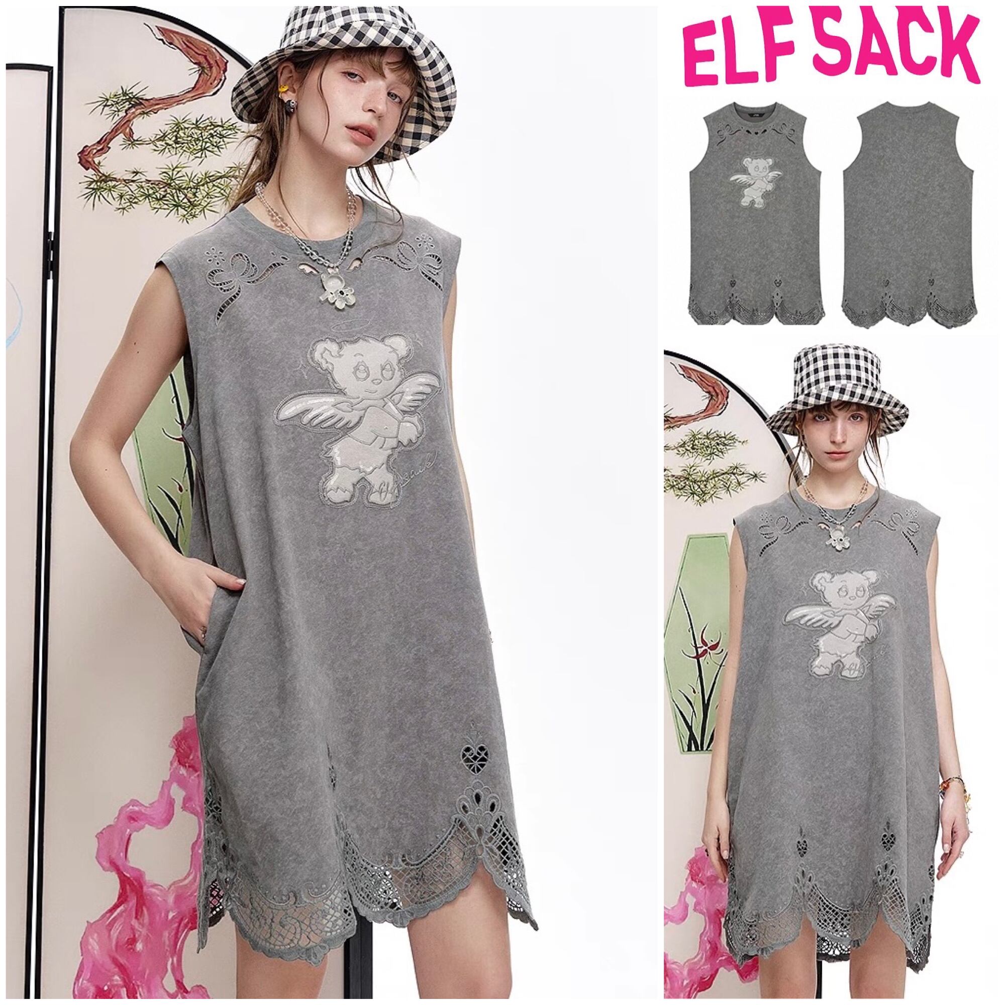 ELF SACK カジュアル 熊 刺繍 ノースリーブ ワンピース グレー