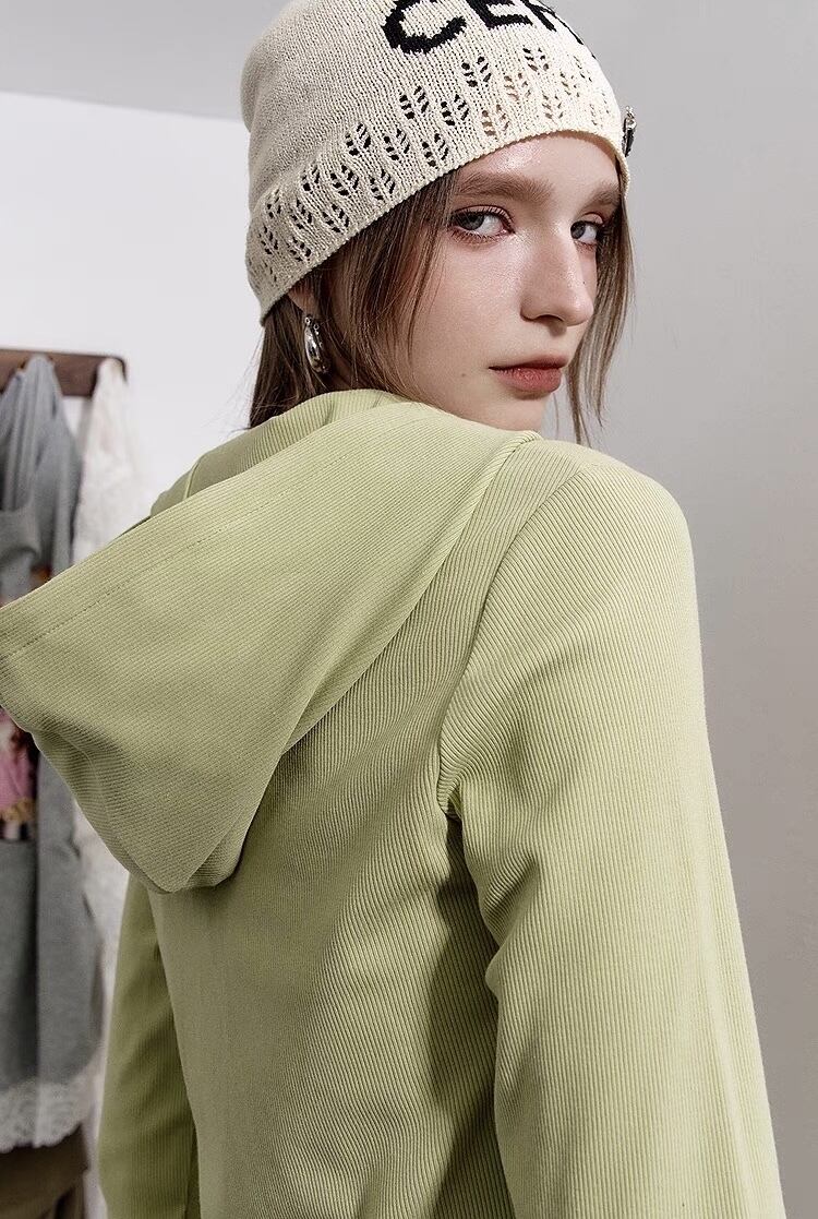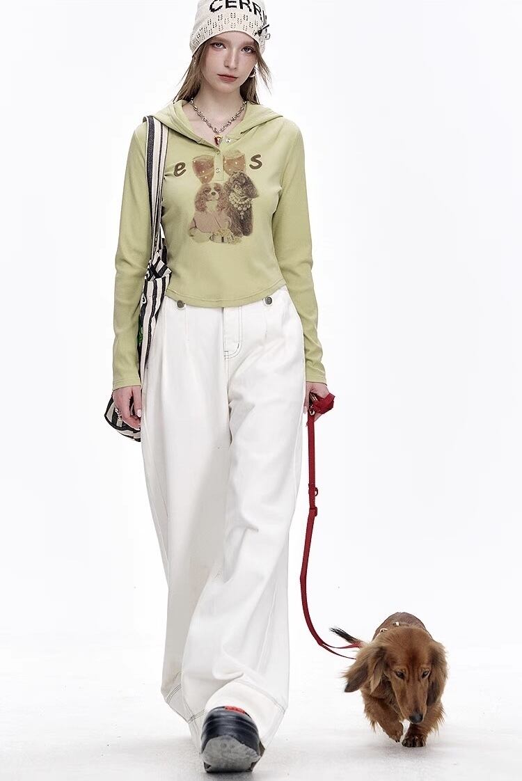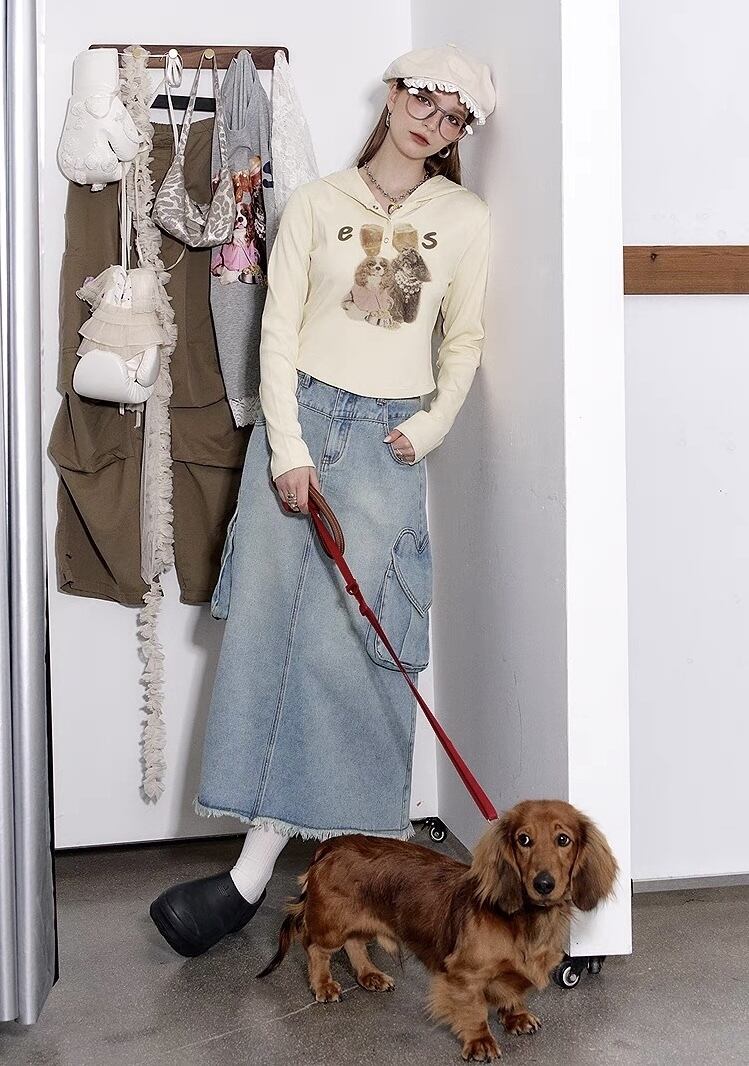 ELF SACK フード付 ドック柄 プリント ショート丈 スリム ロンT