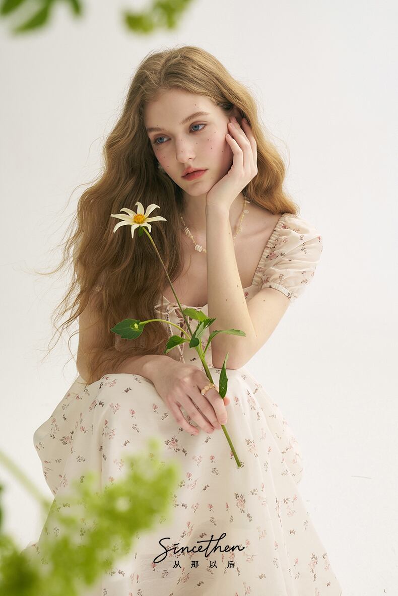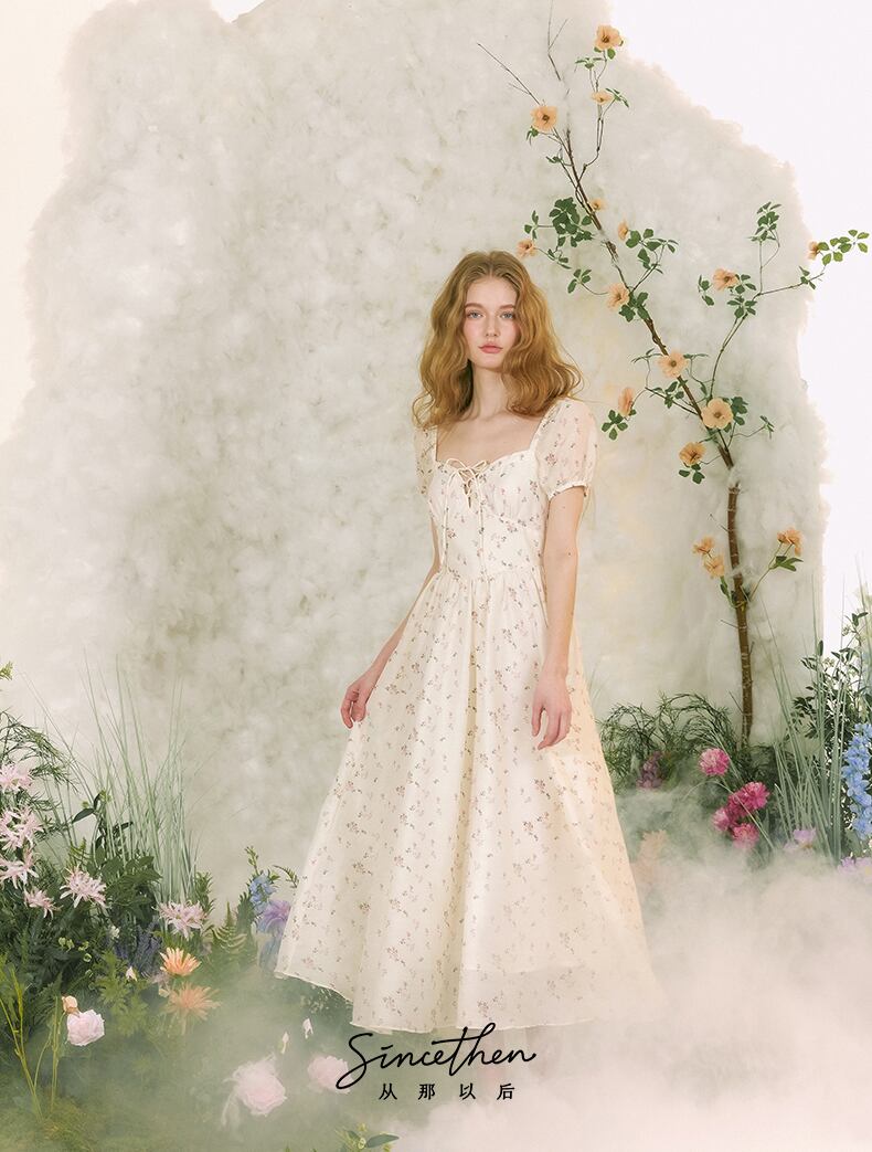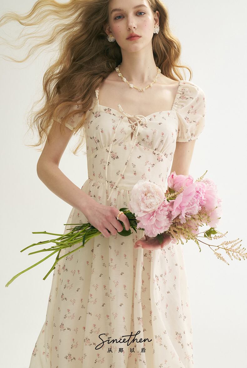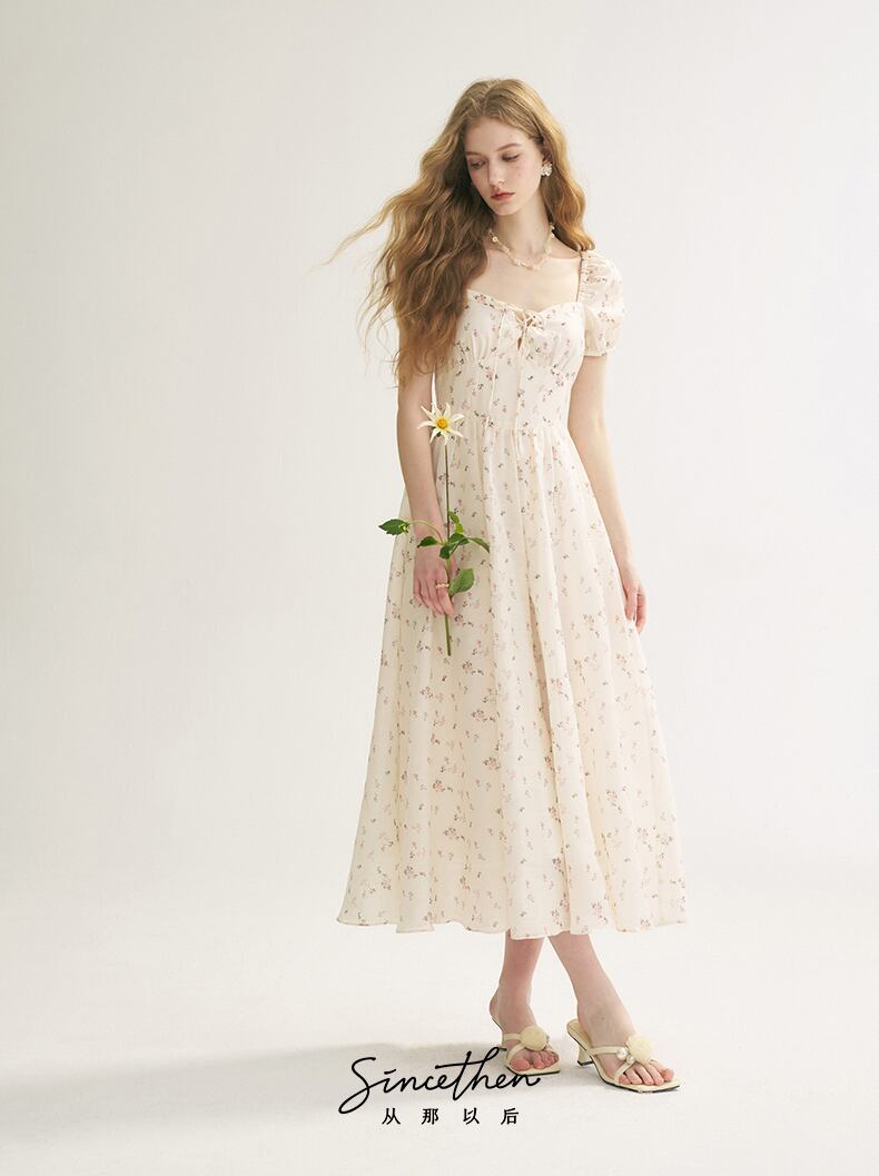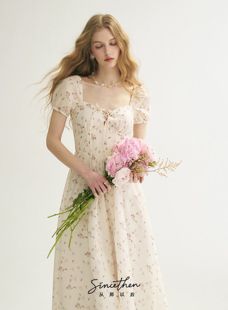 SinceThenキュートリボン パフ フレア ロング ワンピース