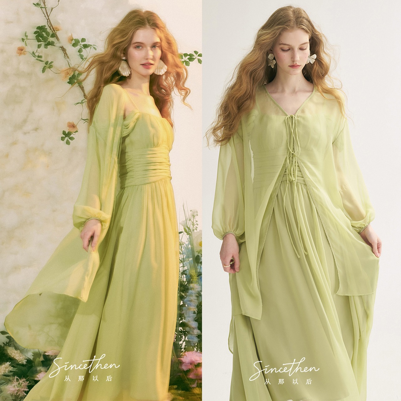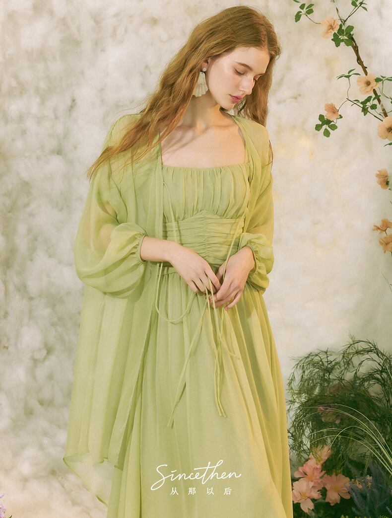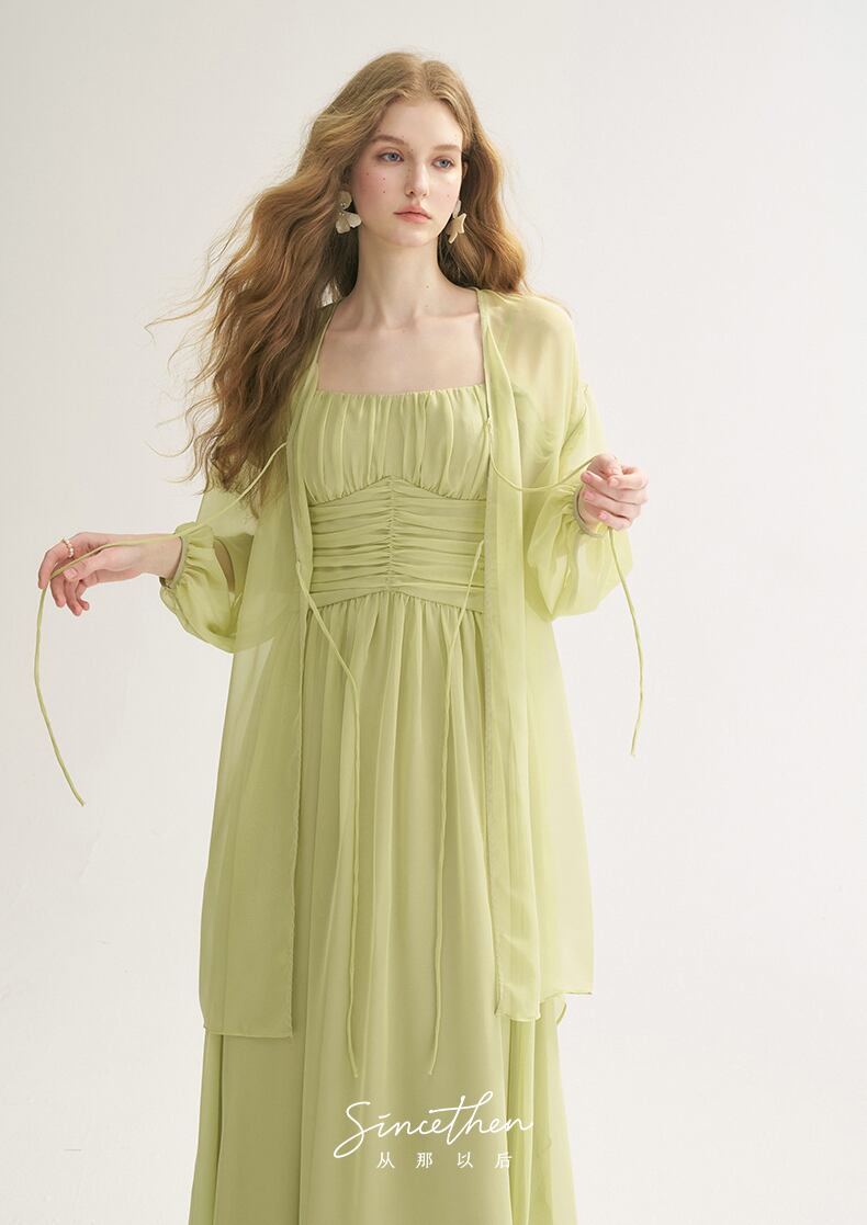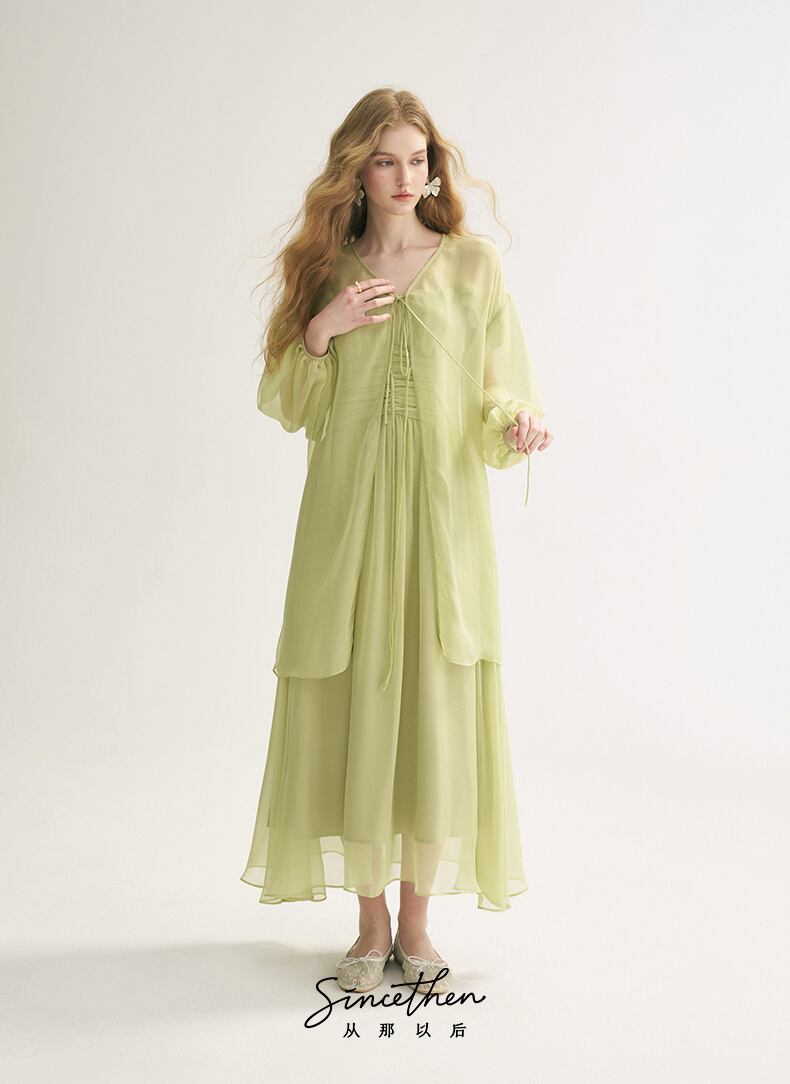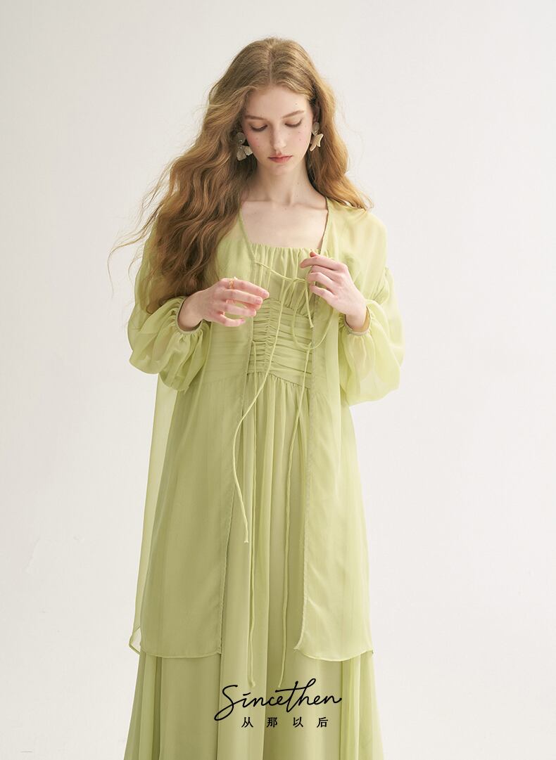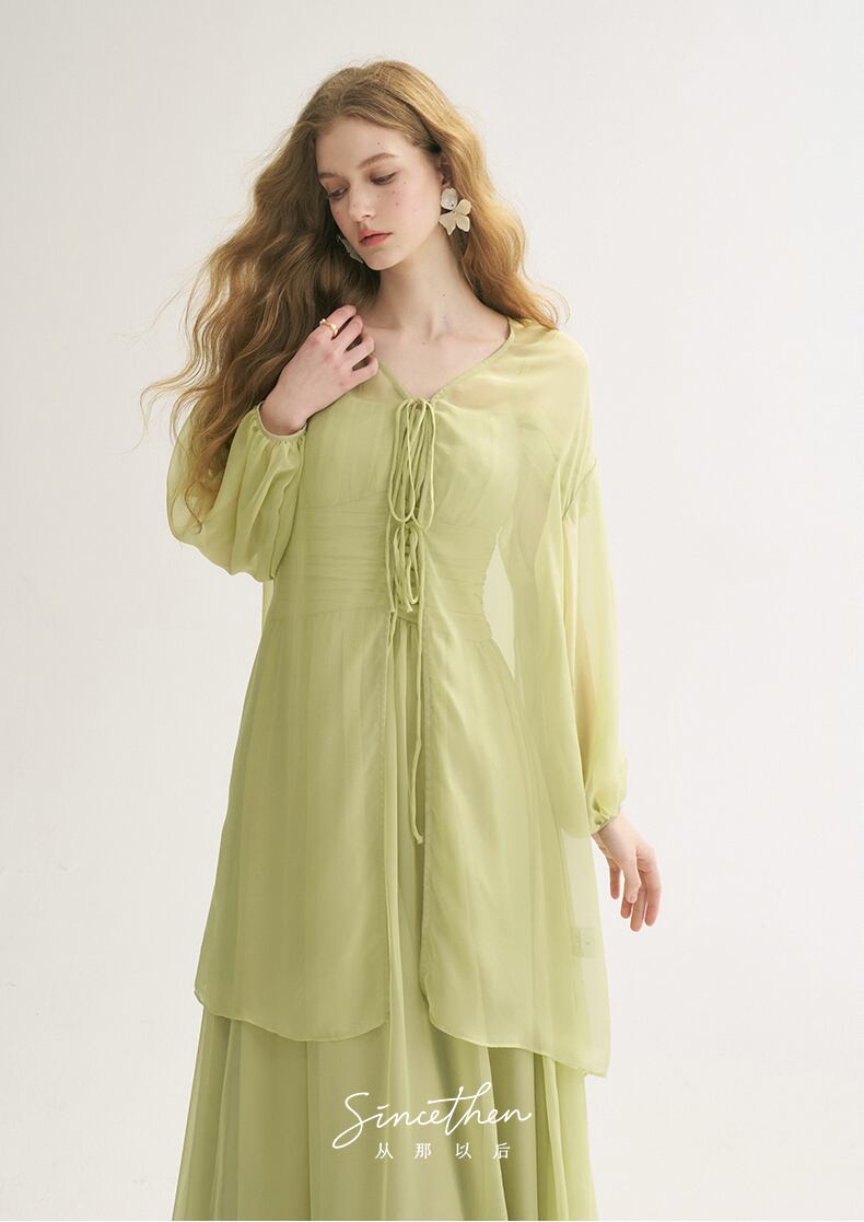 SinceThen ラメ リボンパフスリーブ ロング丈 カーディガン グリーン