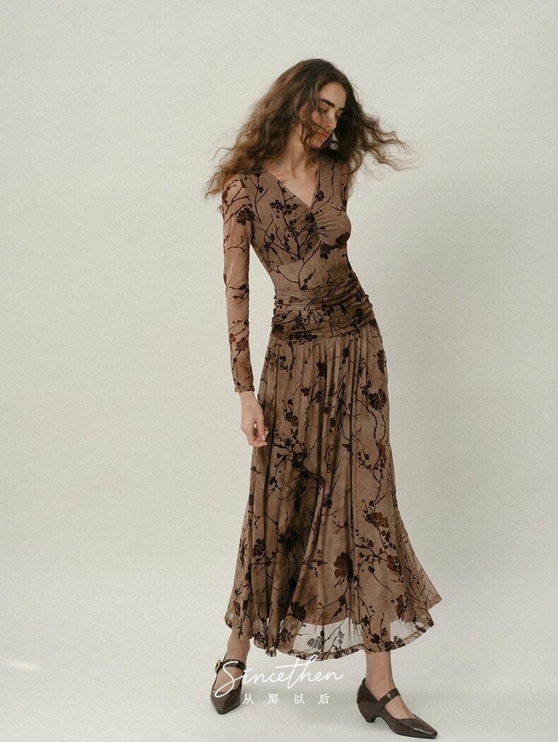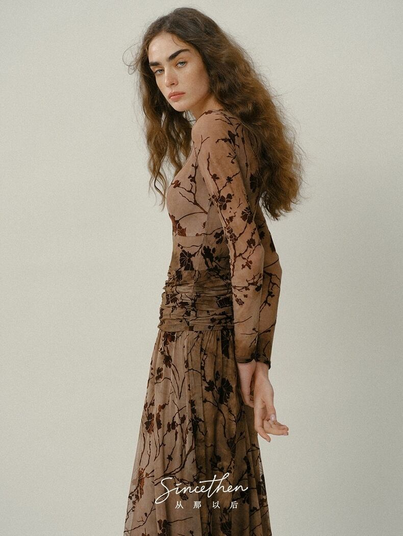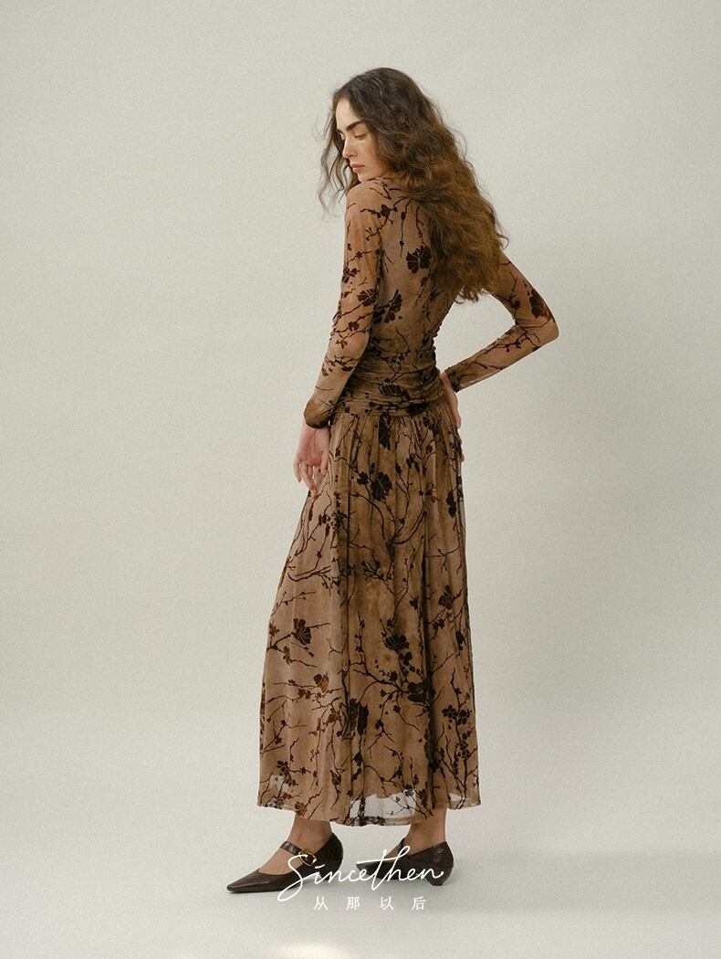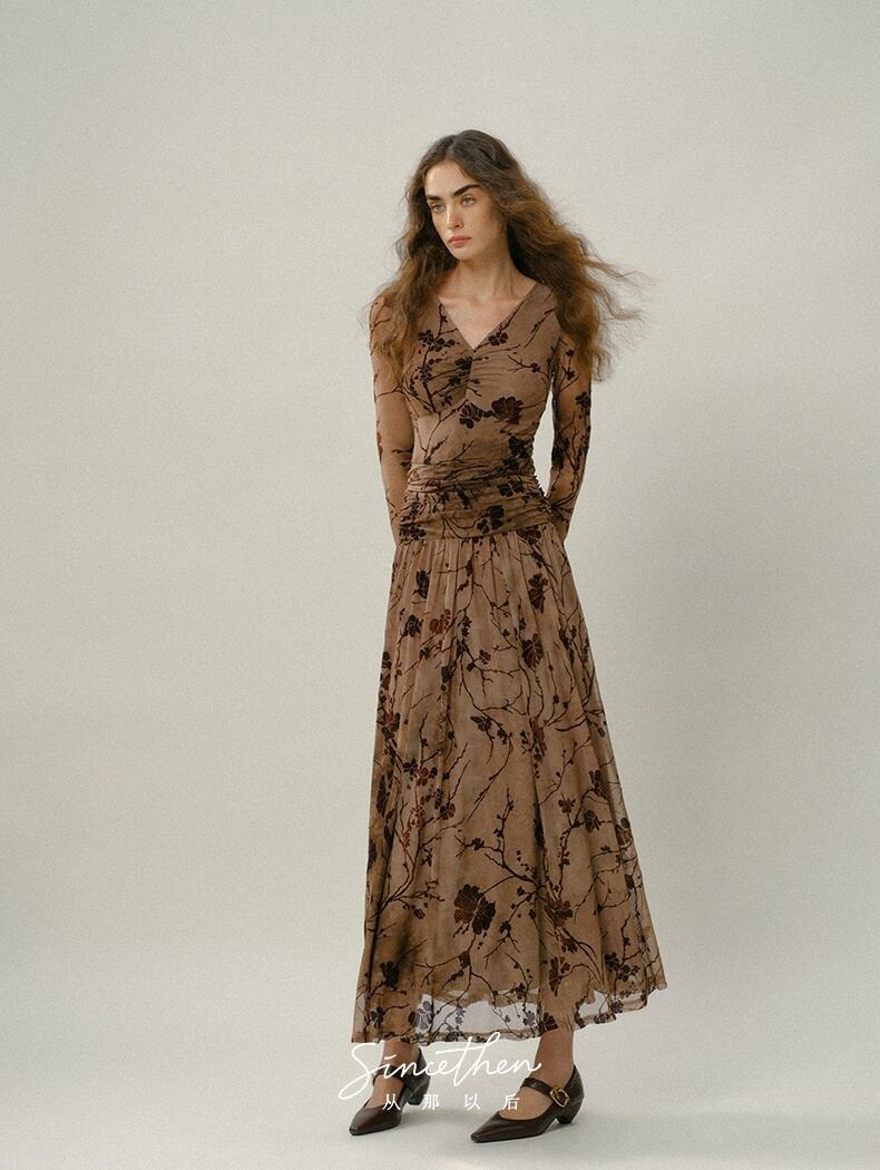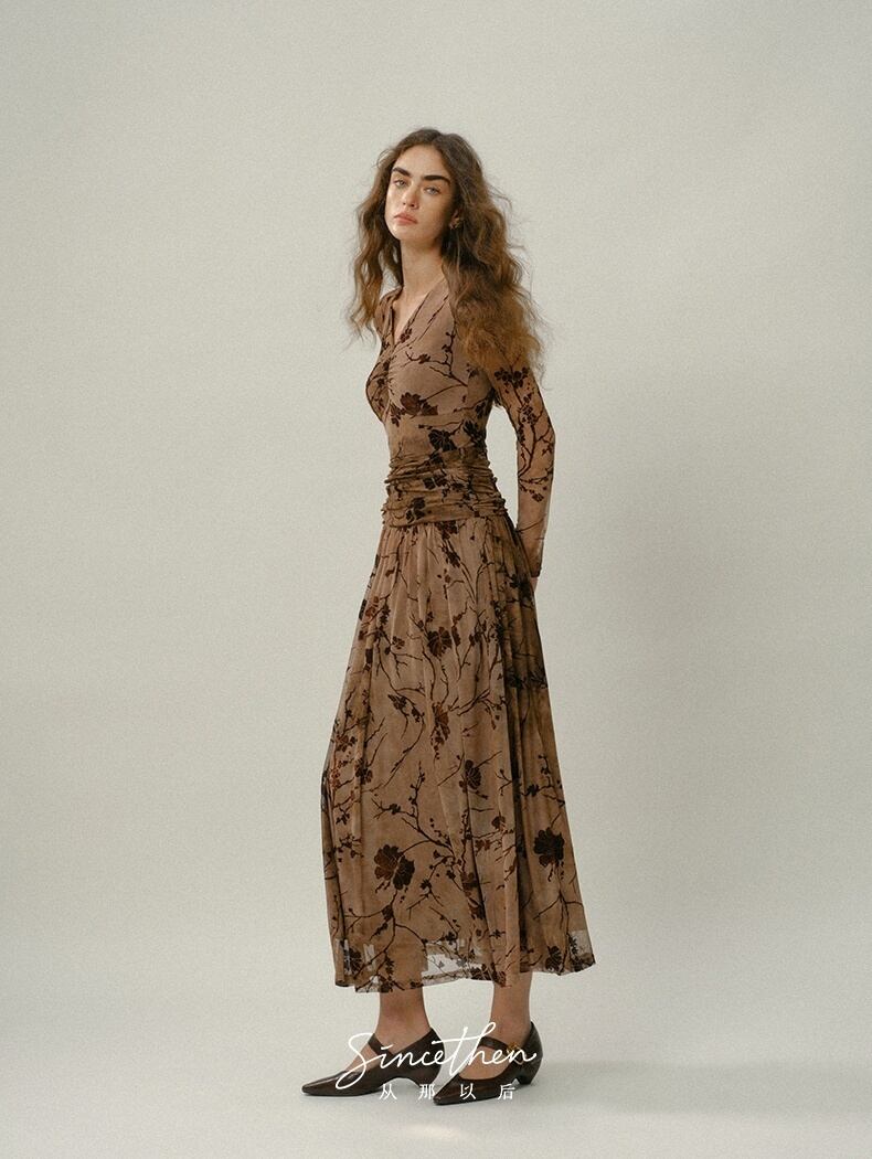 Since Then 長袖花柄ワンピース秋冬エレガント