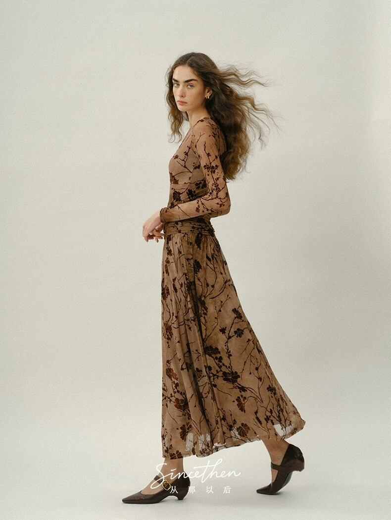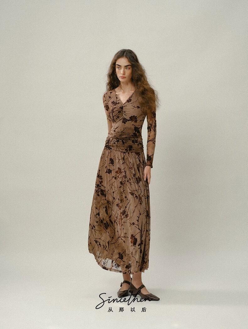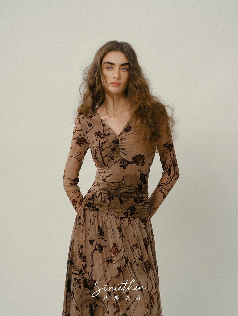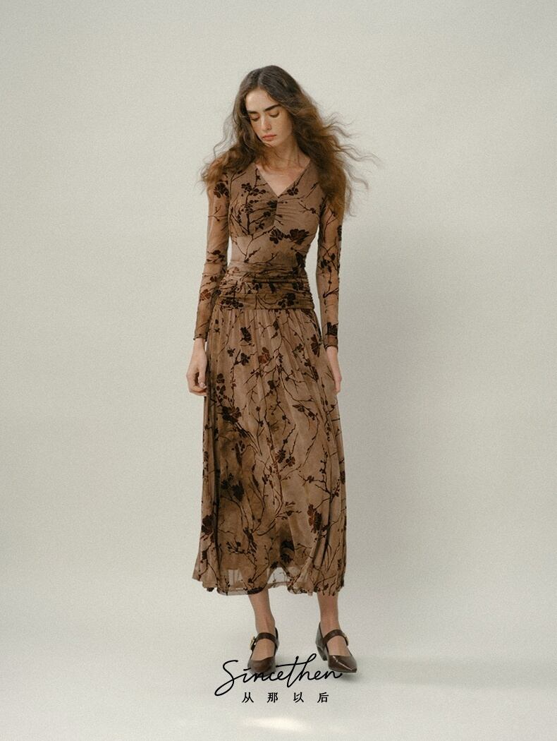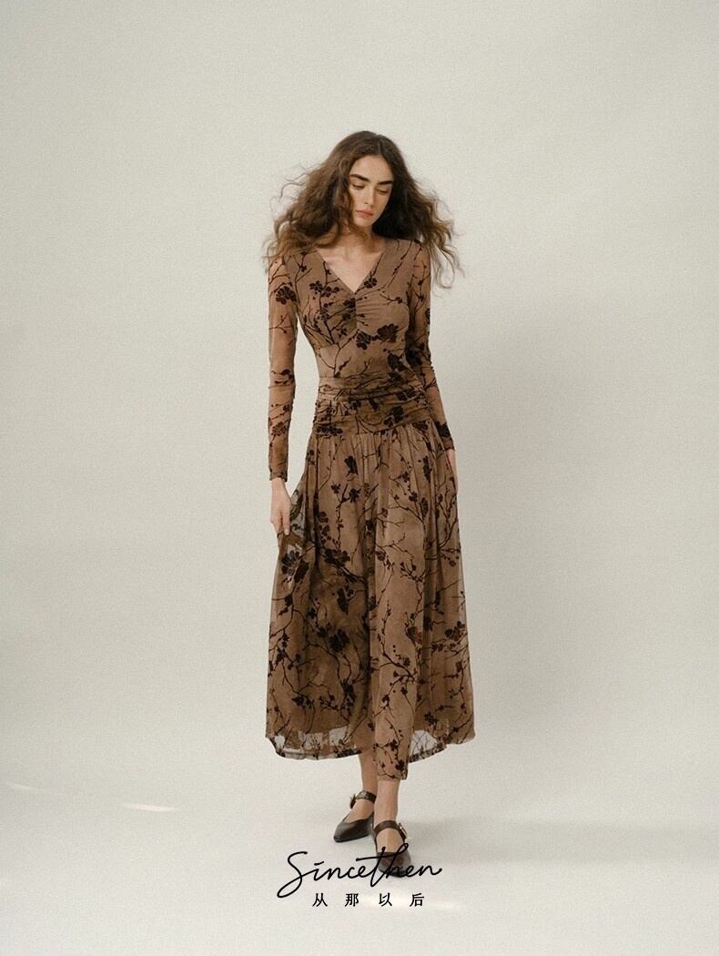 Since Then 長袖花柄ワンピース秋冬エレガント