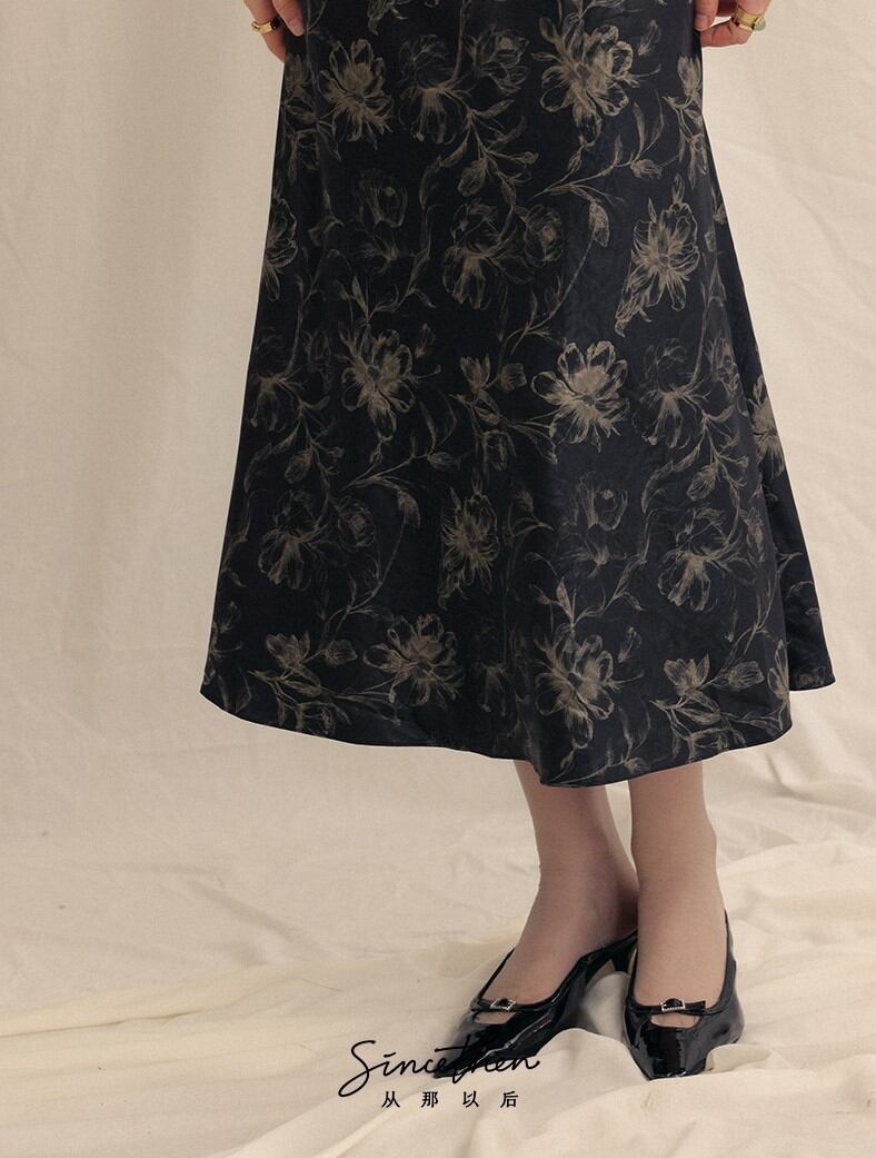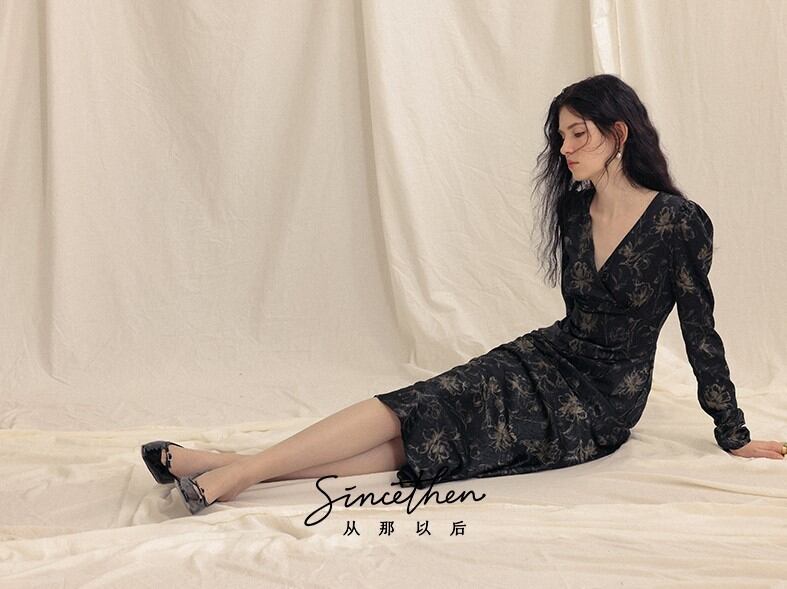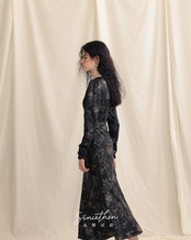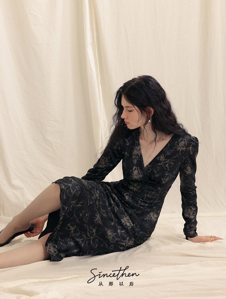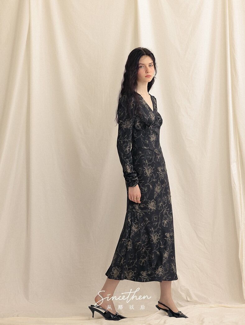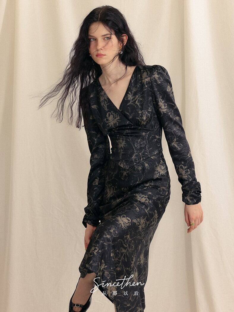 Since Then 花柄 ブラック 長袖ワンピース エレガント秋冬